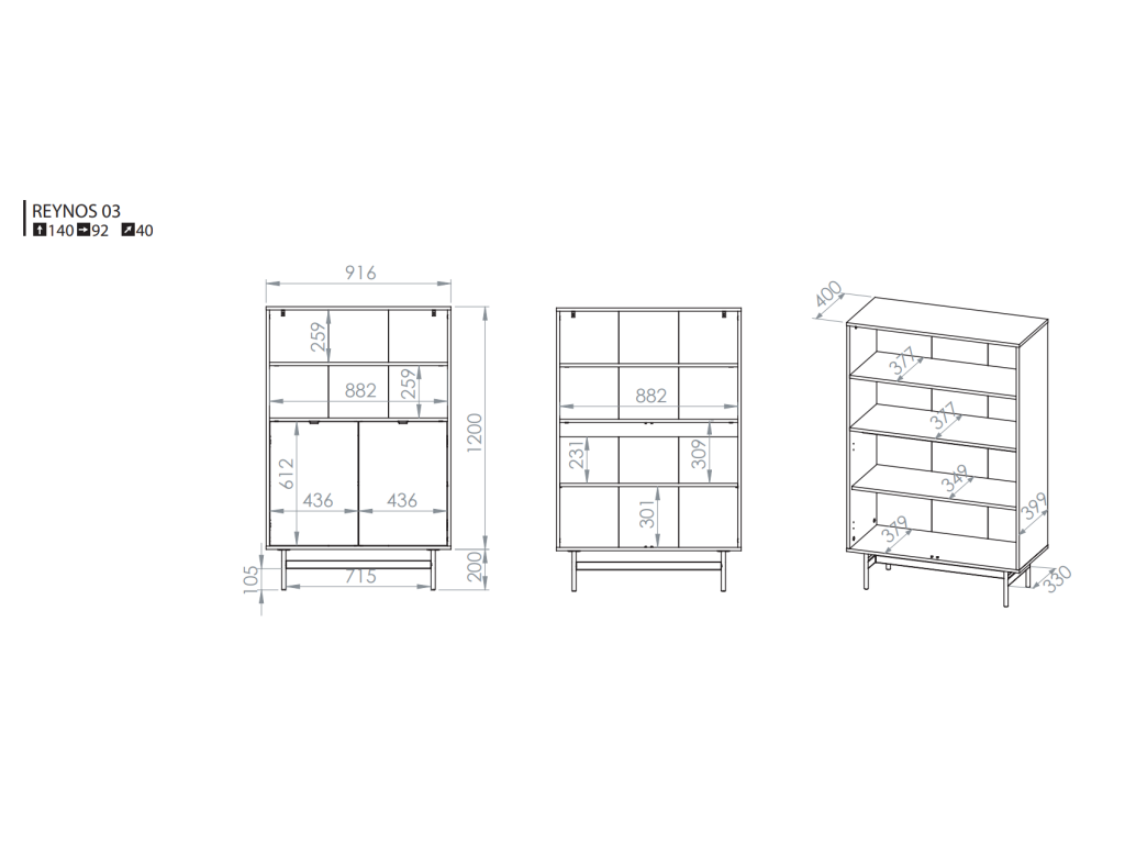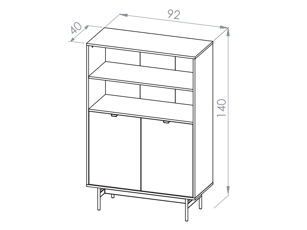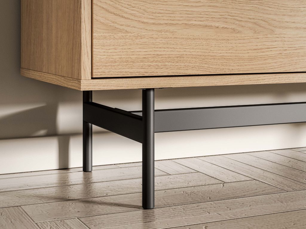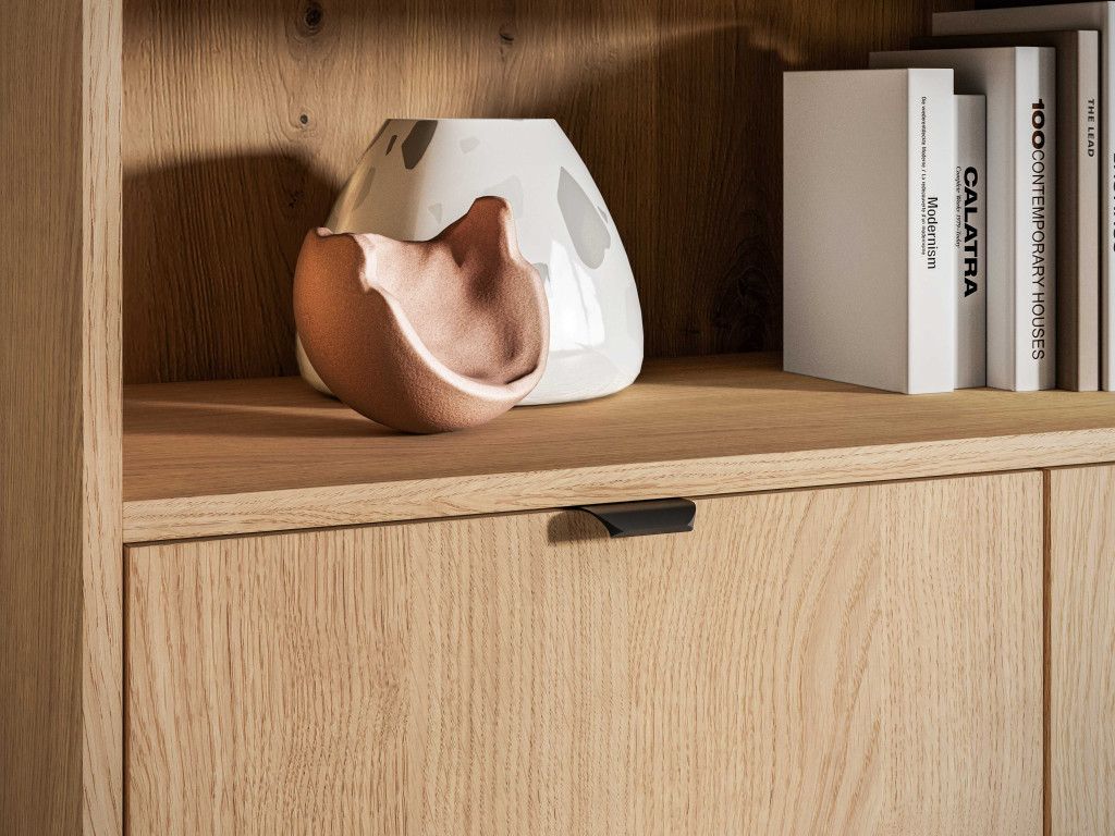 Nízky regál Reynos 03 spája funkciu knižnice a úložnej skrinky v jednom kompaktnom riešení. Horná časť ponúka široké otvorené police, ideálne na knihy, šanóny alebo dekorácie. Spodná časť s dvojicou dverí ukrýva praktický priestor na dokumenty či ďalšie doplnky. Nábytok stojí na vysokých kovových nožičkách, ktoré dodávajú ľahkosť a uľahčujú upratovanie. Detail v podobe čiernych hranových úchytiek a pántov s tichým dovieraním podčiarkuje moderný a funkčný charakter.