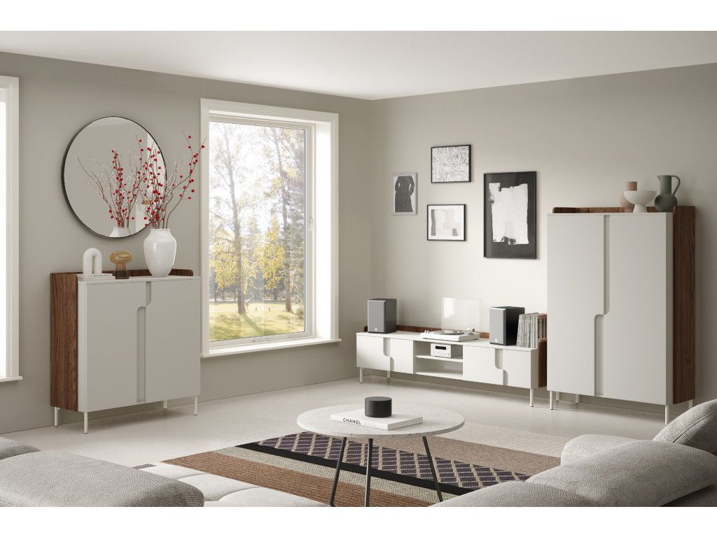 Kombinácia svetlých frontov s dreveným dekorom pôsobí moderne a zároveň prirodzene, pričom vytvára zaujímavý vrstvený efekt. Nábytok je dostupný v dvoch farebných prevedeniach – orech alba / béžová (kašmír) a dub mavelie / macadamia, vďaka čomu sa ľahko prispôsobí rôznym typom interiéru.