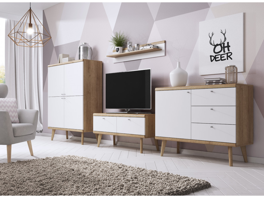 Závesná polica Primo poskytne ďalší priestor na drobnosti a dekorácie vo vašej obývačke. Stačí ju zavesiť nad komodu, gauč či vitrínu. Polica je vyrobená z kvalitnej drevotrieskovej dosky potiahnutej laminátom. Farebné prevedenie dubu a bielej zapasuje do moderného aj klasického interiéru.