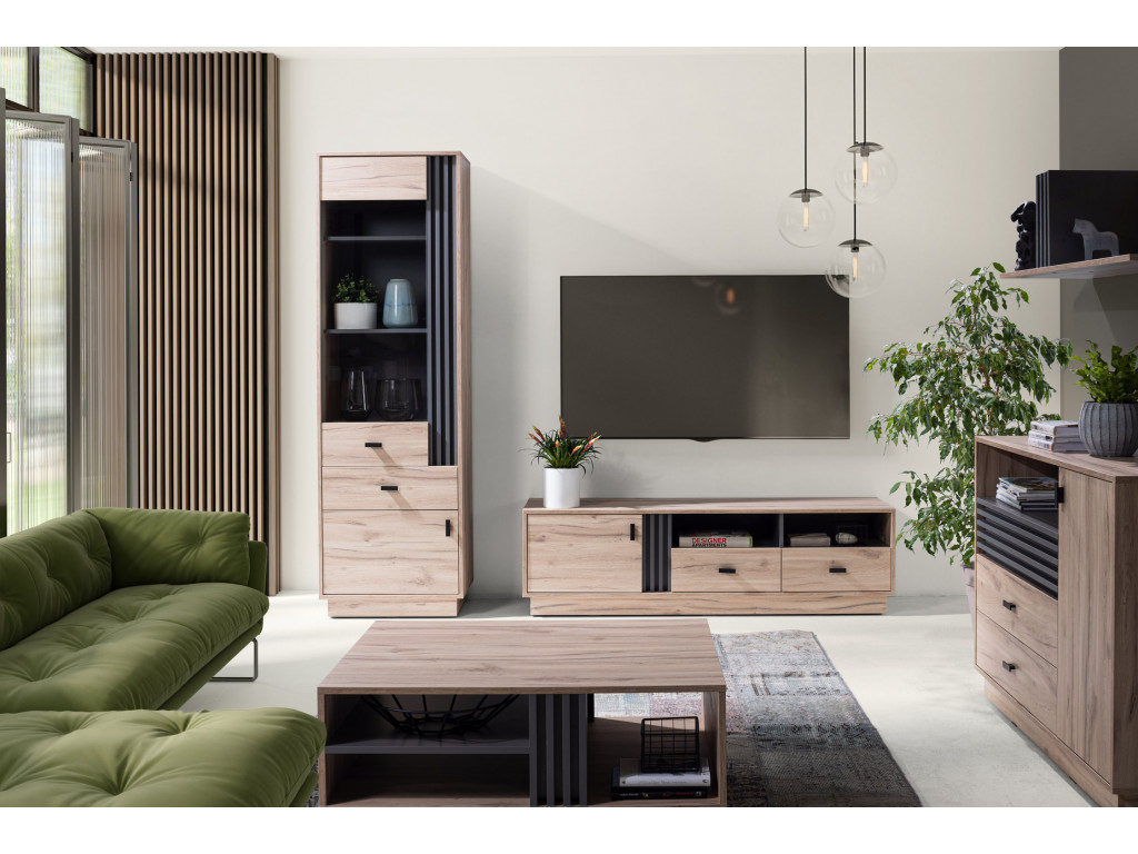 Elegantný regál do obývačky, je vyrobený v modernom dizajne. Kombinácia dekoru dub estana a antracit vnesie do interiéru príjemný dizajn. Regál je ľahko kombinovateľný s iným nábytkom z kolekcie Allmo, a so svojimi rozmermi ho zmestíte naozaj všade. Regál je vyrobený z laminovanej dosky zakončenej ABS hranami.