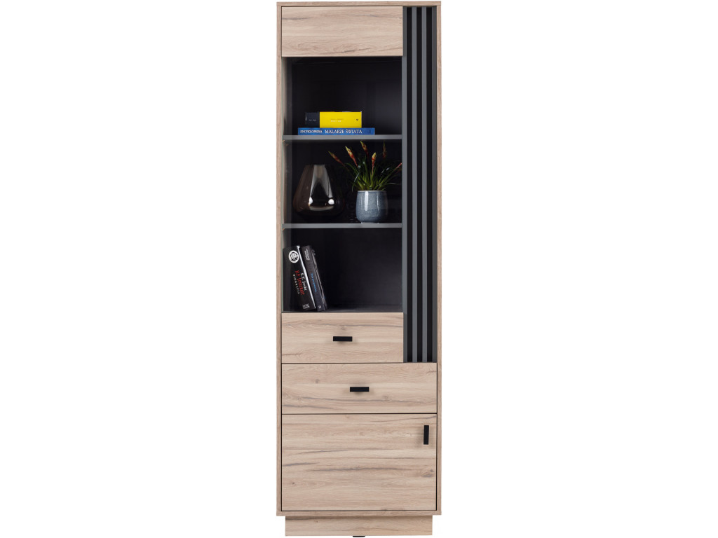 Doplňte obývačku alebo kanceláriu o moderný kúsok. Vysoký regál Allmo 03 zapadne do modernej aj klasickej miestnosti. Originálny dizajn dotvárajú antracitové prvky. Regál disponuje 3 otvorenými policami, 2 zásuvkami a skrinkou.
