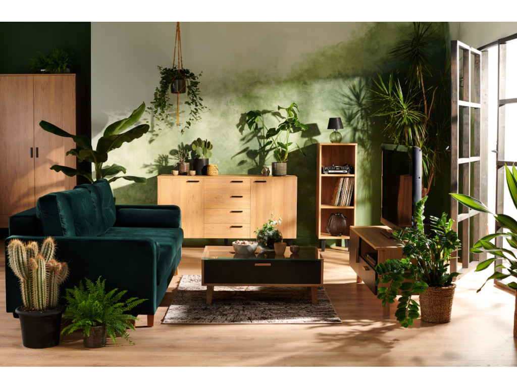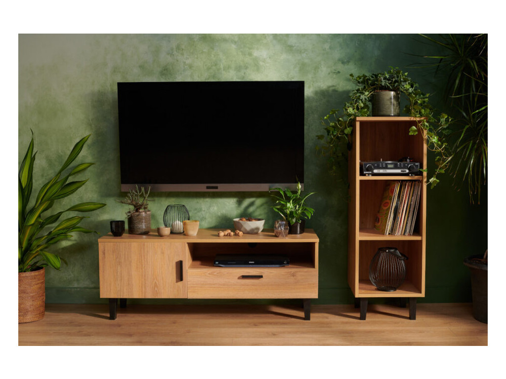 Knižnica bola vyrobená pre ľudí, ktorí ocenia moderný a jednoduchý štýl. Hnedá farba laminátu, drevené nohy a povrchová úprava zdôrazňujú jeho škandinávsky štýl a dodávajú mu eleganciu. Nábytok bude dokonale ladiť s ostatnými prvkami dekoru v škandinávskom štýle a dodá interiéru osobitú atmosféru. Veľké množstvo políc vám umožní uložiť rôzne predmety. Dôležité je, že vďaka otvorenému priestoru neplnia police len organizačnú funkciu – vďaka nim je možné vystaviť aj doplnky a dekorácie, ktoré potešia hostí a vďaka ktorým sa budeme cítiť ako doma.