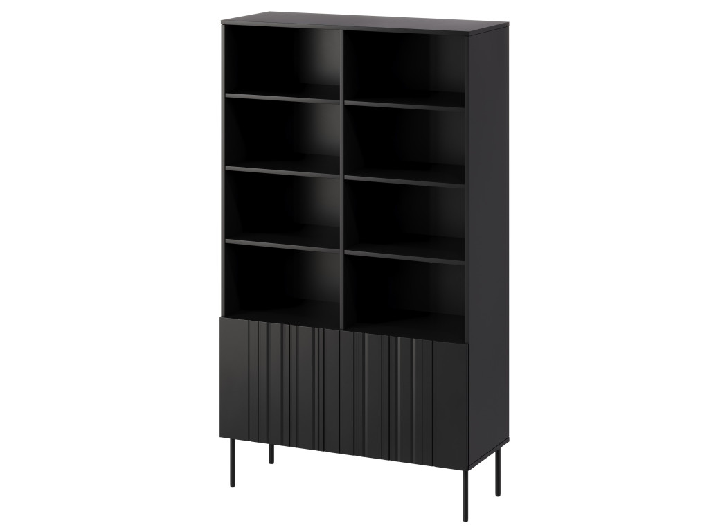 Elegantný regál Isla v čiernej farbe s rozmermi 100 × 40 × 174,5 cm ponúka 8 otvorených políc a 2 dvierka v spodnej časti. Vďaka PUSH TO OPEN systému a kovovým nožičkám (20 cm) pôsobí moderne a vzdušne.