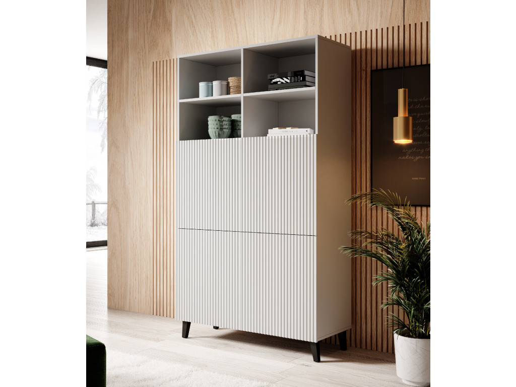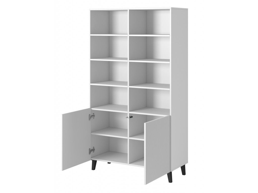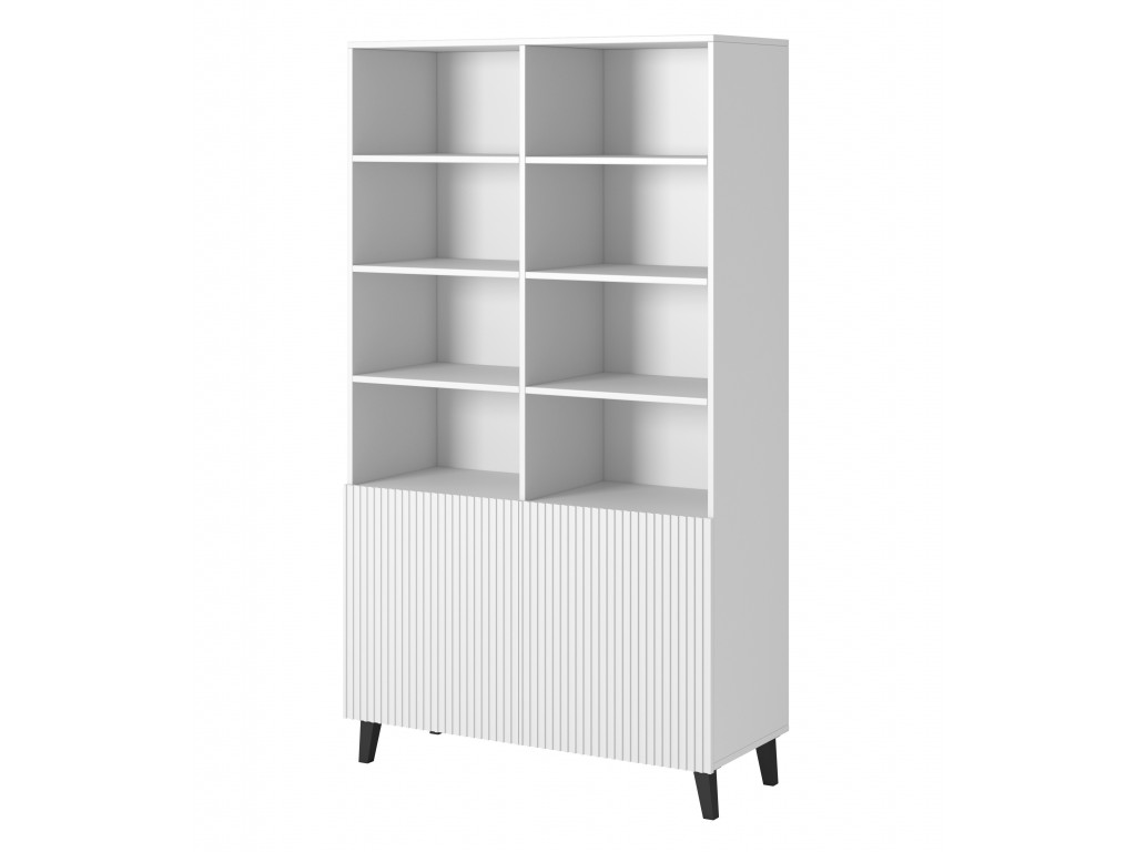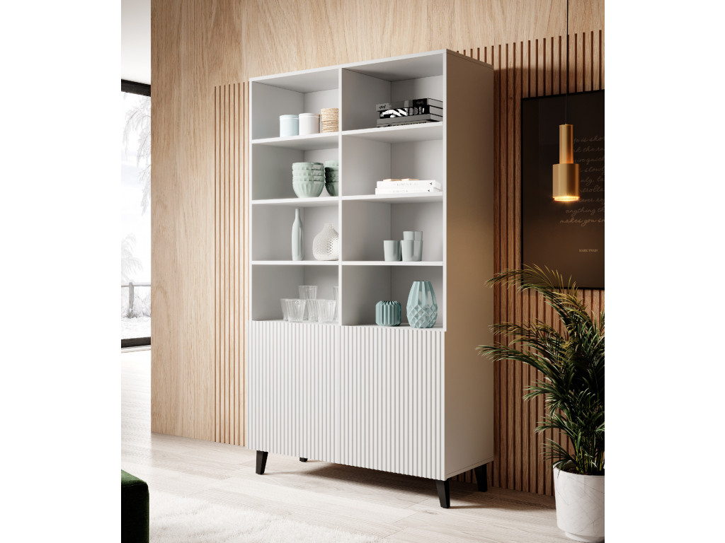 Regál s dvierkami PAFOS je vyhotovený z odolnej MDF dosky potiahnutej PCV fóliou. Inakosť mu pritom dodávajú ryhované čelá. Ďalším zaujímavým detailom sú nožičky, na ktorých regál stojí.