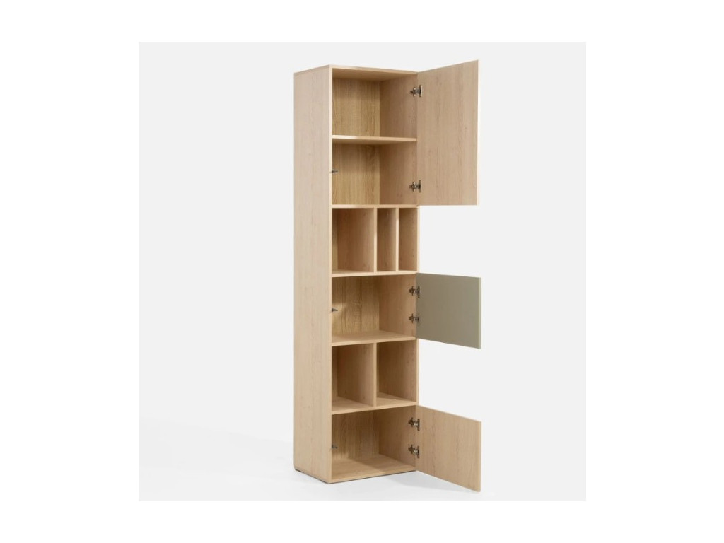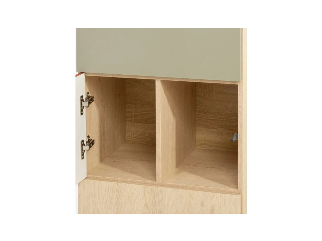 Regál Salsa SL3 je trojdverový úložný prvok s kombináciou otvorených a uzavretých políc, ktorý ponúka praktické a prehľadné riešenie na uskladnenie rôznych predmetov. Súčasťou regálu sú otvorené police, vhodné na knihy, dekorácie alebo školské potreby, a uzavreté časti chránené dvierkami. Stredné dvierka sú v zelenej farbe, čím vytvárajú výrazný kontrast k dekoru dub a oranžovým akcentom. Regál pôsobí moderne a dynamicky, pričom zachováva funkčný charakter.