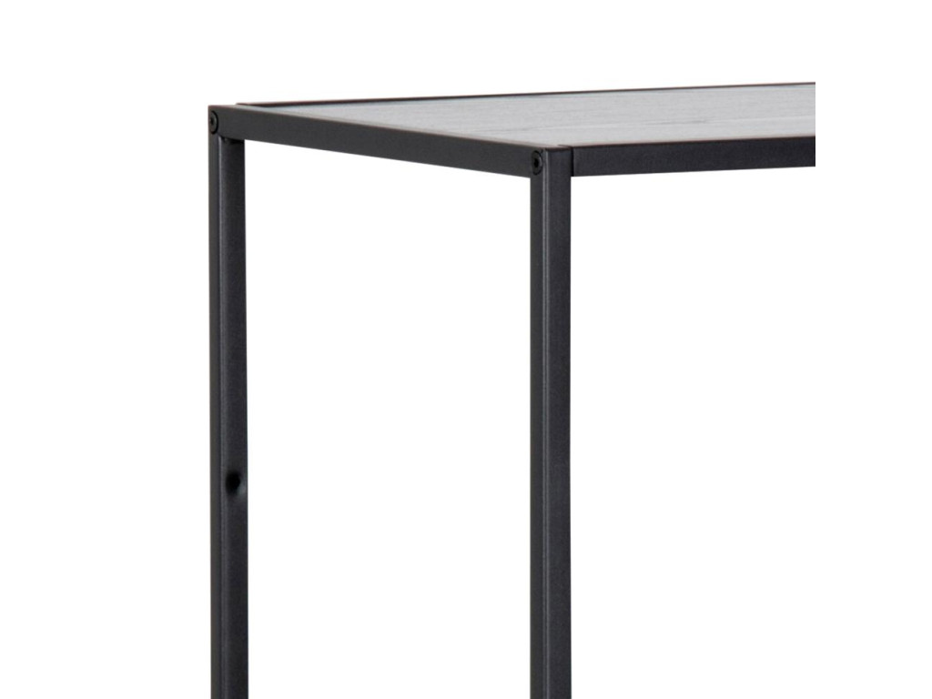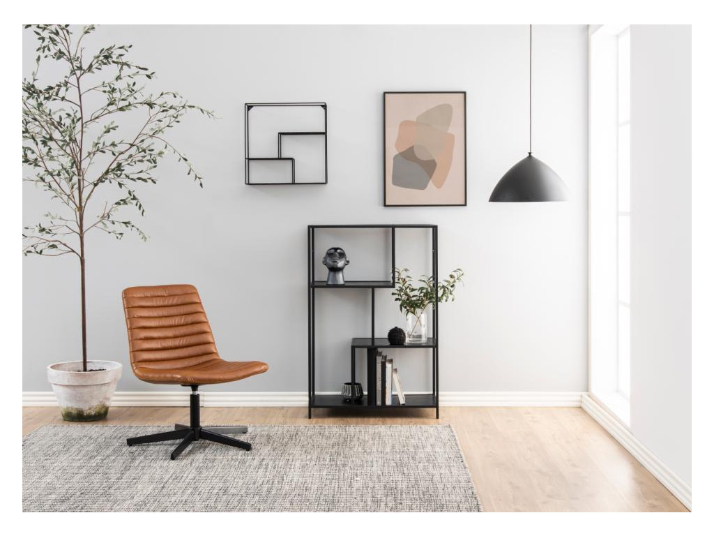 V úplne čiernom vyhotovení pôsobí trojpolicový regál Seaford ako elegantný, jednotný akcent. Matné police v dekore čierneho jaseňa splývajú so štíhlym oceľovým rámom v rovnakom odtieni, takže vynikne čistá geometria a vystavené predmety. Vysoký len 114 cm a hlboký 35 cm dodá úložný priestor aj menšiemu priestoru – od zakladačov v pracovni až po rastliny či sviečky v obývačke. Celkové rozmery: 77 × 35 × 114 cm.