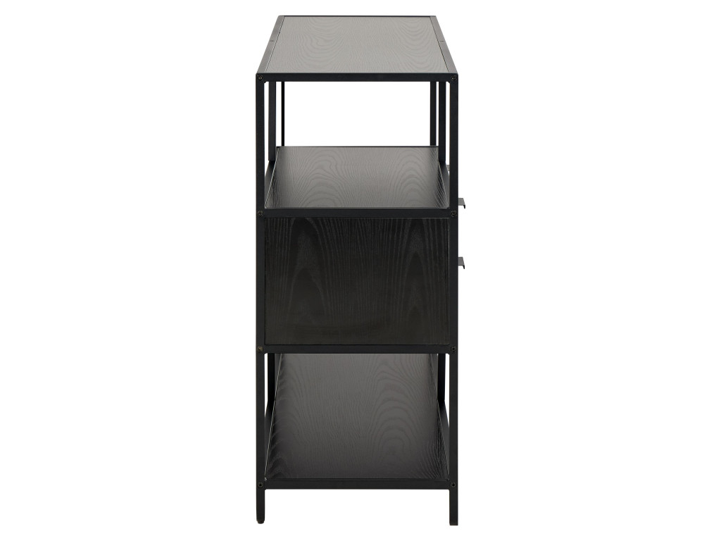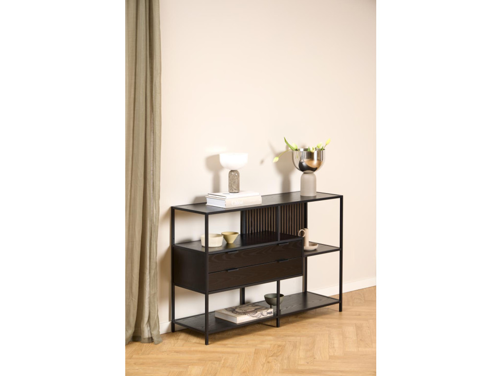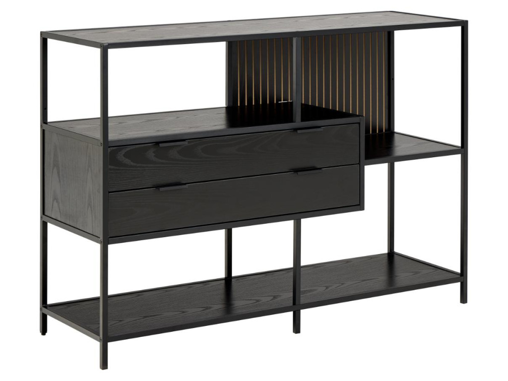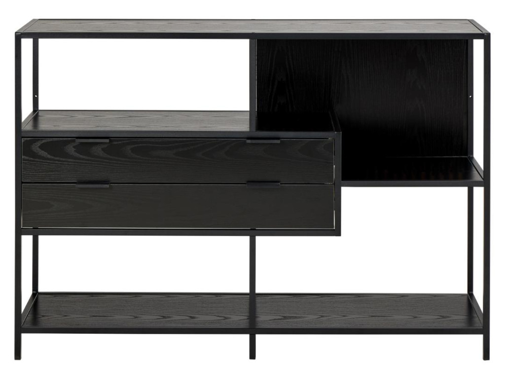 Dominantná čierna dodáva regálu Seaford ( 114 × 35 × 78 cm) industriálny výraz. Matné police a zásuvky v dekore čierneho jaseňa ladia tón v tón s oceľovým rámom v čiernej práškovo lakovanej úprave, takže nábytok ľahko zapadne do škandinávskych, minimalistických aj moderných interiérov, kde oceníte pokojný, harmonický farebný akcent.