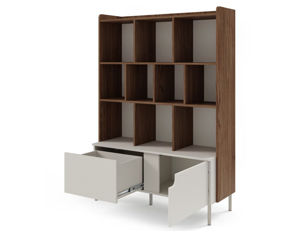 Široký regál Positano PO5 v prevedení orech alba / kašmírová béžová zaujme výrazným dizajnom a praktickým riešením úložného priestoru. Kontrast tmavšieho orecha a svetlej béžovej vytvára moderný a dynamický vzhľad. Otvorené police ponúkajú dostatok miesta na knihy či dekorácie. Spodná časť dopĺňa funkčnosť o zásuvku a skrinku pre skrytý úložný priestor. Bezúchytkové riešenie push to open (Tip-On) zachováva čisté línie a pohodlie pri používaní.