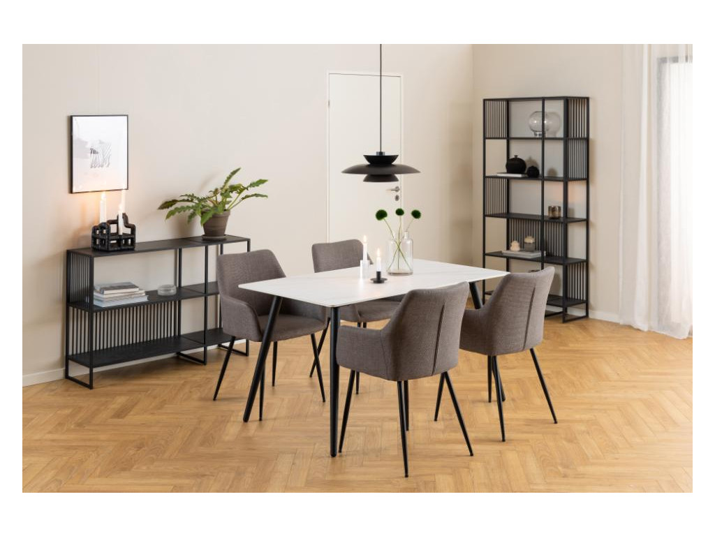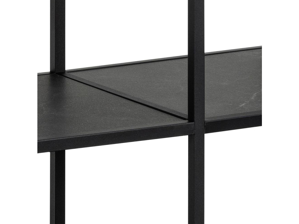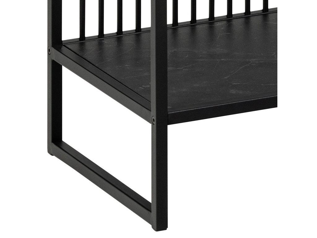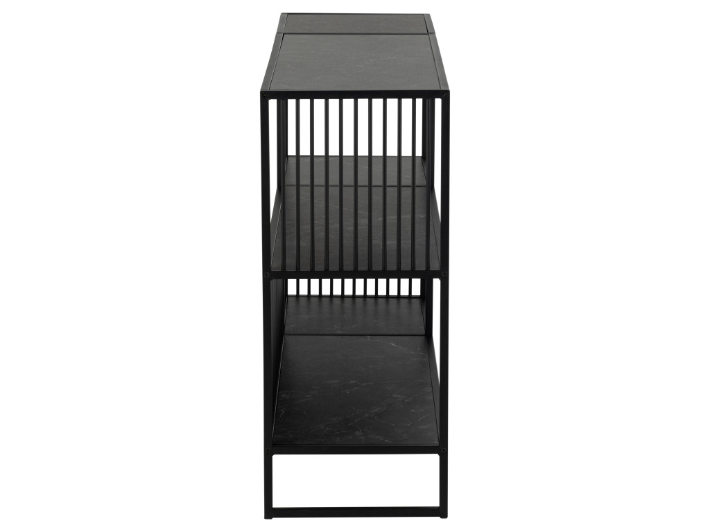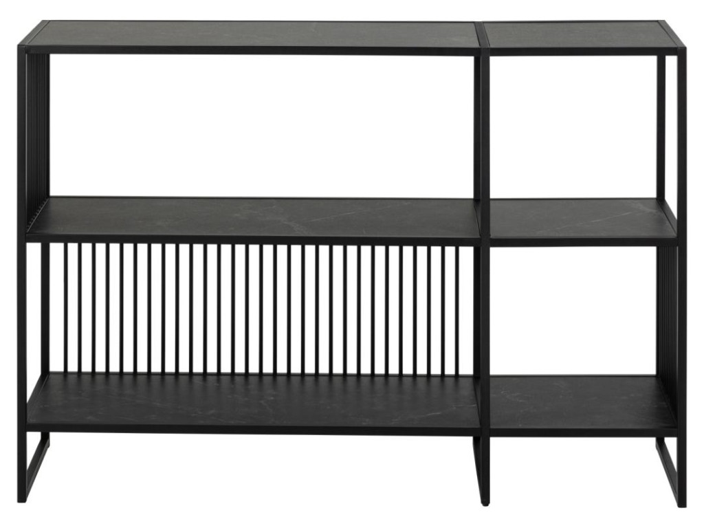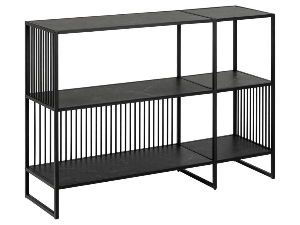 Regál z kolekcie Strington je navrhnutý tak, aby priniesol do interiéru výrazný, no funkčný dizajnový prvok. Dve police v dekore čierneho mramoru (matná čierna Izmir) sú zasadené do robustného oceľového rámu so zvislými drôtmi, ktoré vytvárajú architektonickú štruktúru a vizuálnu hĺbku. Vďaka svojmu nízkemu a širokému formátu (83 cm výška) sa hodí ako knižnica, odkladací priestor na dekorácie či úložná konzola do vstupnej haly alebo obývačky. Drsný melamínový povrch políc aj matná čierna oceľová konštrukcia s práškovým nástrekom zaručujú dlhú životnosť a ľahkú údržbu.