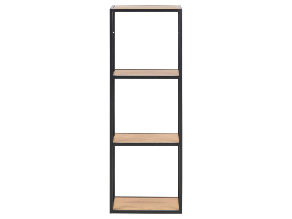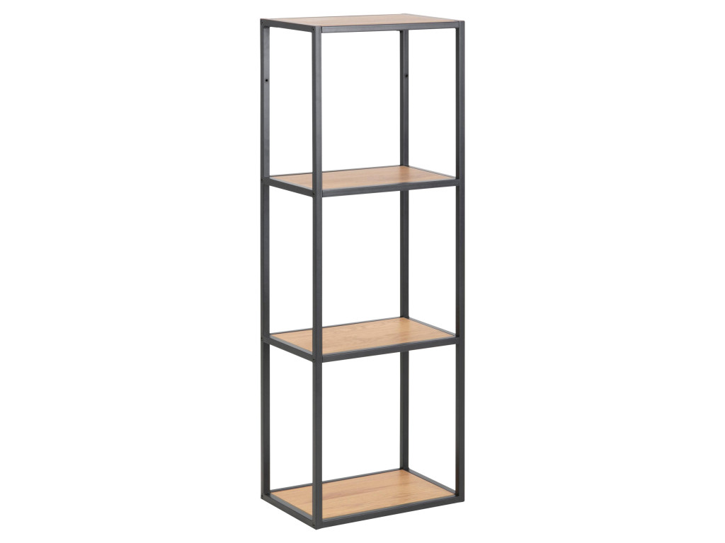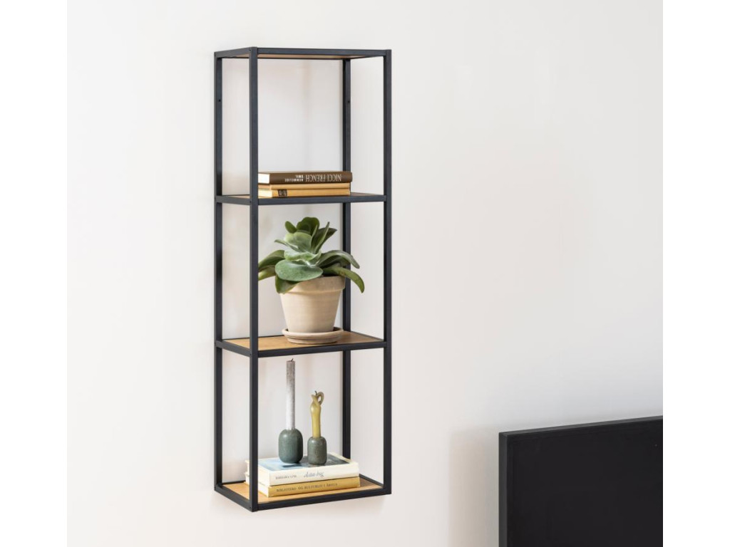 Štíhly obdĺžnikový rám z matnej čiernej ocele nesie štyri pevné police v dekore divokého duba. Kontrast chladného kovu a teplého drevodekoru okamžite pritiahne pohľad a prehlbí priestor – či už ju zavesíte pri pohovke, do predsiene alebo nad pracovný stôl. Vysoký, úzky formát (iba 24 cm na šírku) sa zmestí aj na úzky pás steny, no vďaka výške 108 cm ponúkne dostatok miesta pre rastliny, sviečky či malú zbierku kníh.