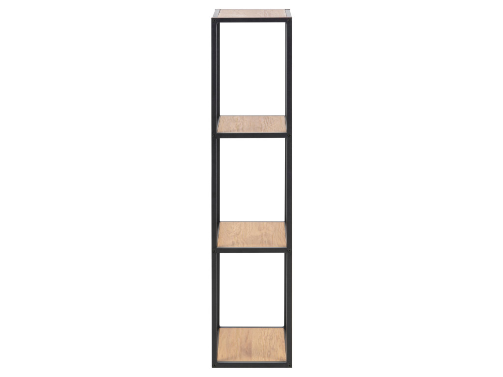 - Materiály: oceľový rám (matná čierna, práškový lak), MDF police (matný divoký dub)