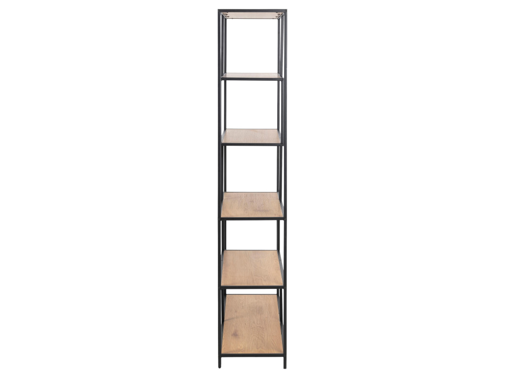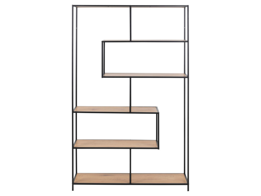 Regál Seaford v industriálnom štýle spája teplý dekor divokého duba s čiernou kovovou konštrukciou. Asymetrické usporiadanie políc umožňuje kreatívne uloženie kníh a dekorácií. Ideálny doplnok do moderných obývačiek alebo kancelárií. Pôsobí vzdušne aj napriek svojej veľkosti.