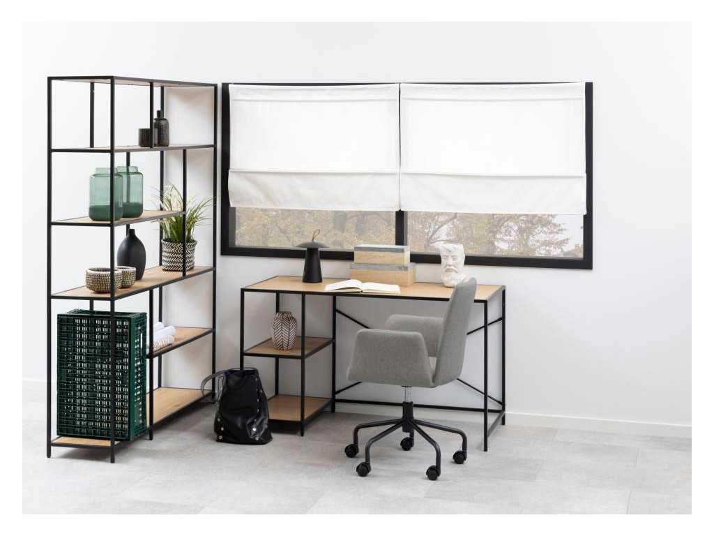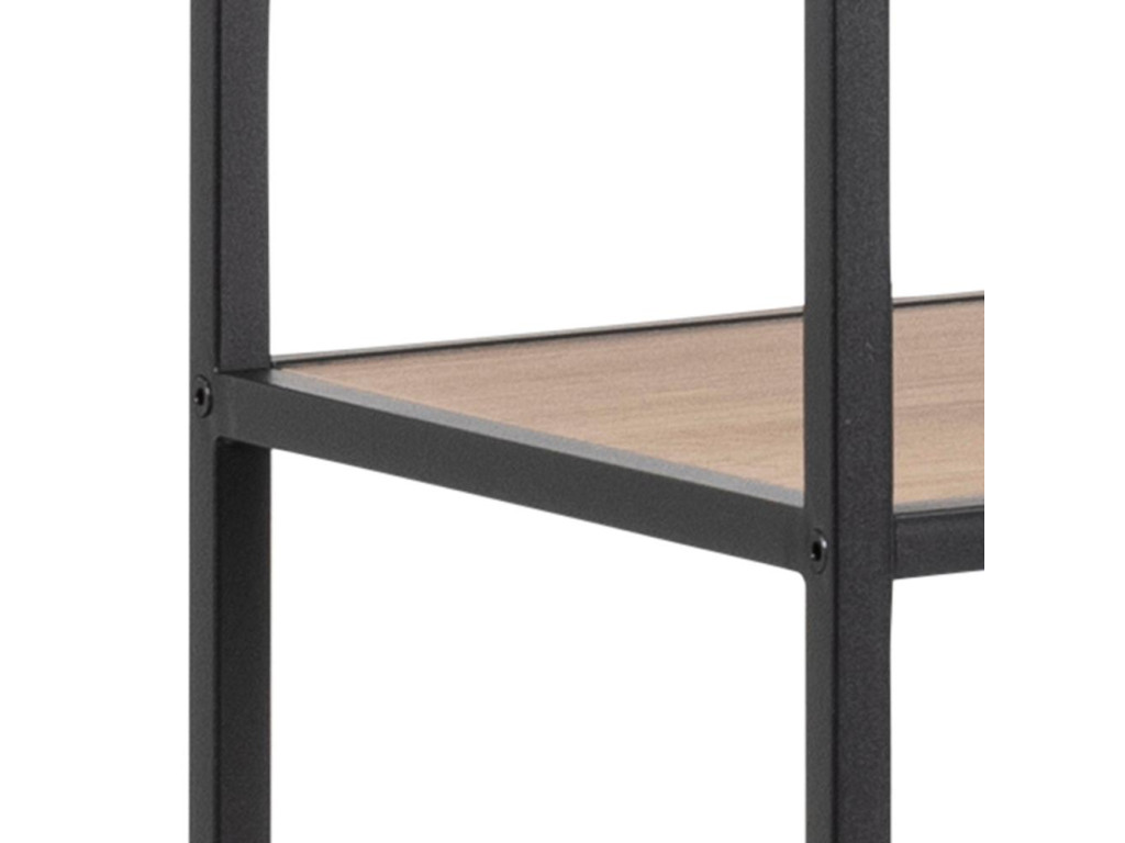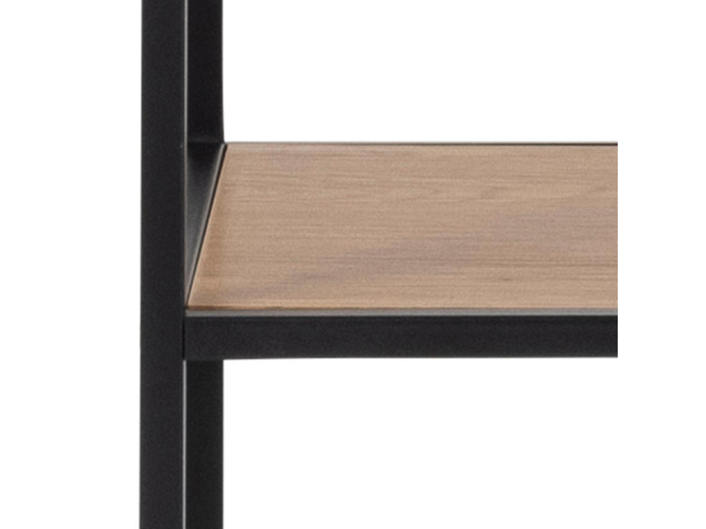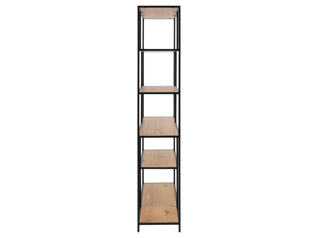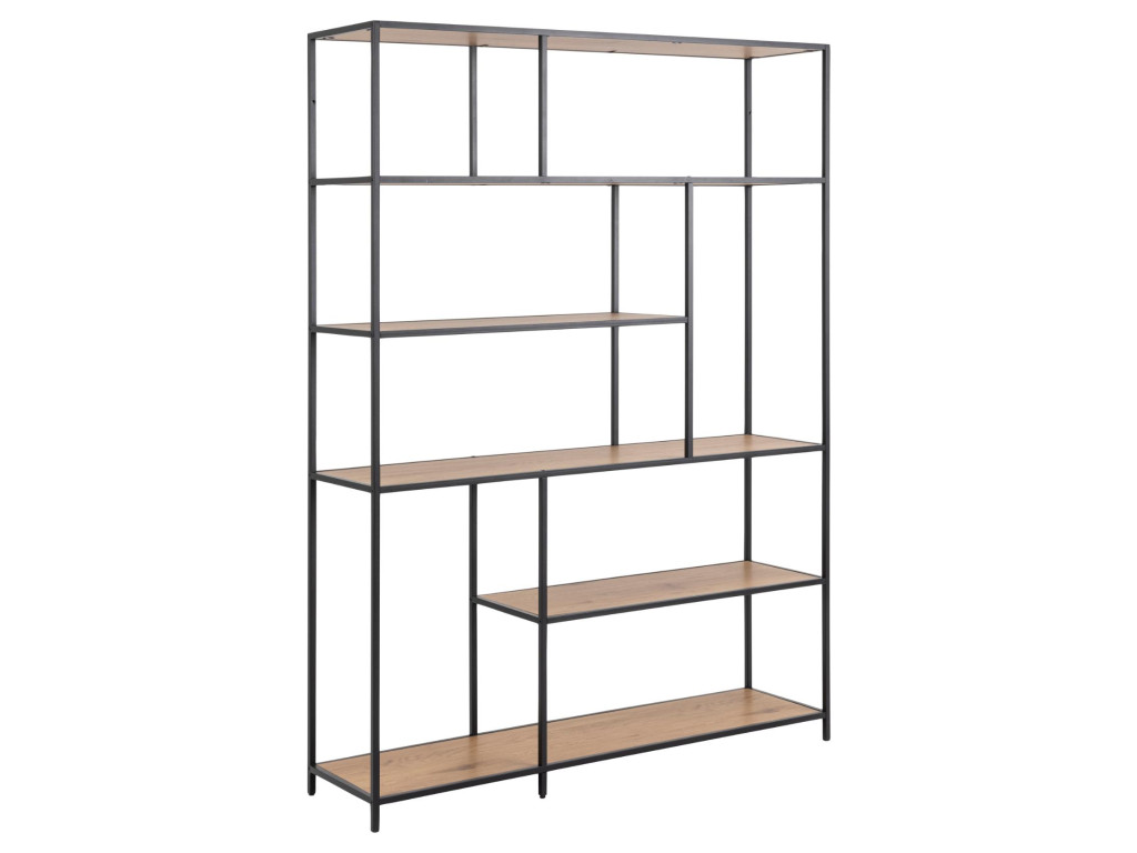 Regál Seaford vo veľkom formáte ponúka dostatok úložného priestoru pre knihy, dekorácie či dokumenty. Industriálny vzhľad z matnej čiernej ocele a dekóru divokého duba dodáva interiéru charakter. Vďaka asymetrickému usporiadaniu pôsobí vizuálne dynamicky. Je ideálny do obývačky, kancelárie alebo štúdia.
