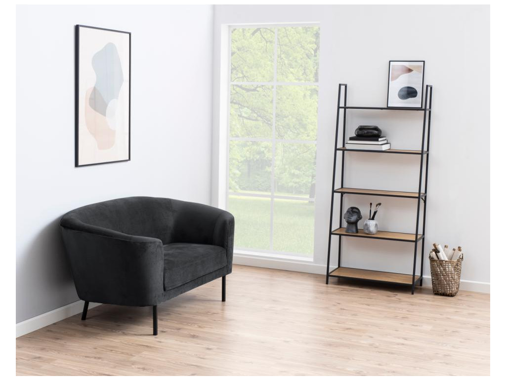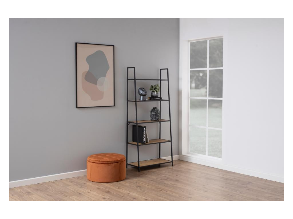 Tento rebríkový regál dodá stene zdravú dávku loftového šmrncu. Štíhly rám z matnej čiernej ocele stúpa nahor a nesie päť políc v dekore matného divokého duba, ktoré akoby sa postupne opierali o stenu. Kontrast chladného kovu a teplej drevenej textúry vytvorí príjemnú, no pritom výraznú kulisu pre knihy, rastliny či obľúbené dekorácie a bez námahy sa zmestí do obývačky, pracovne aj predsiene.