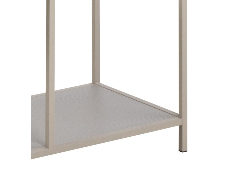 Povrchy z melamínu stačí utrieť vlhkou handričkou a sivý práškovaný kov odolá škrabancom aj každodennému používaniu. Štvorcové nohy (výška 6,3 cm) s plastovými krytkami šetria podlahu a horná polica unesie až 18 kg, takže bez obáv uložíte aj ťažšie artbooky či dekoratívne vázy.