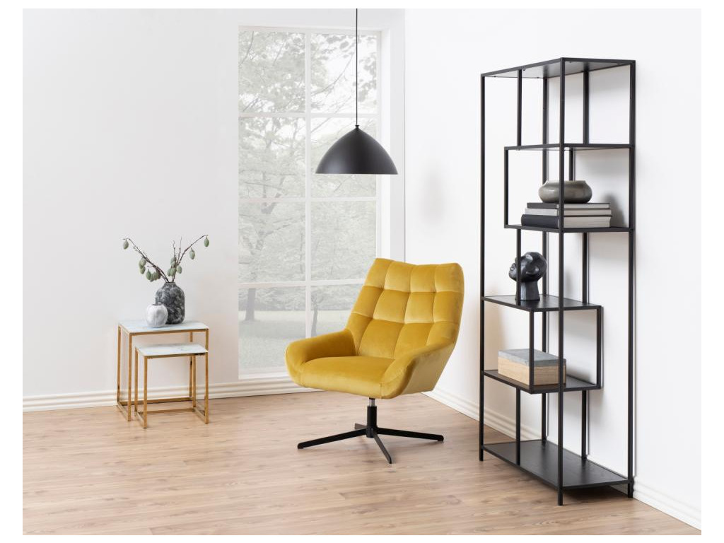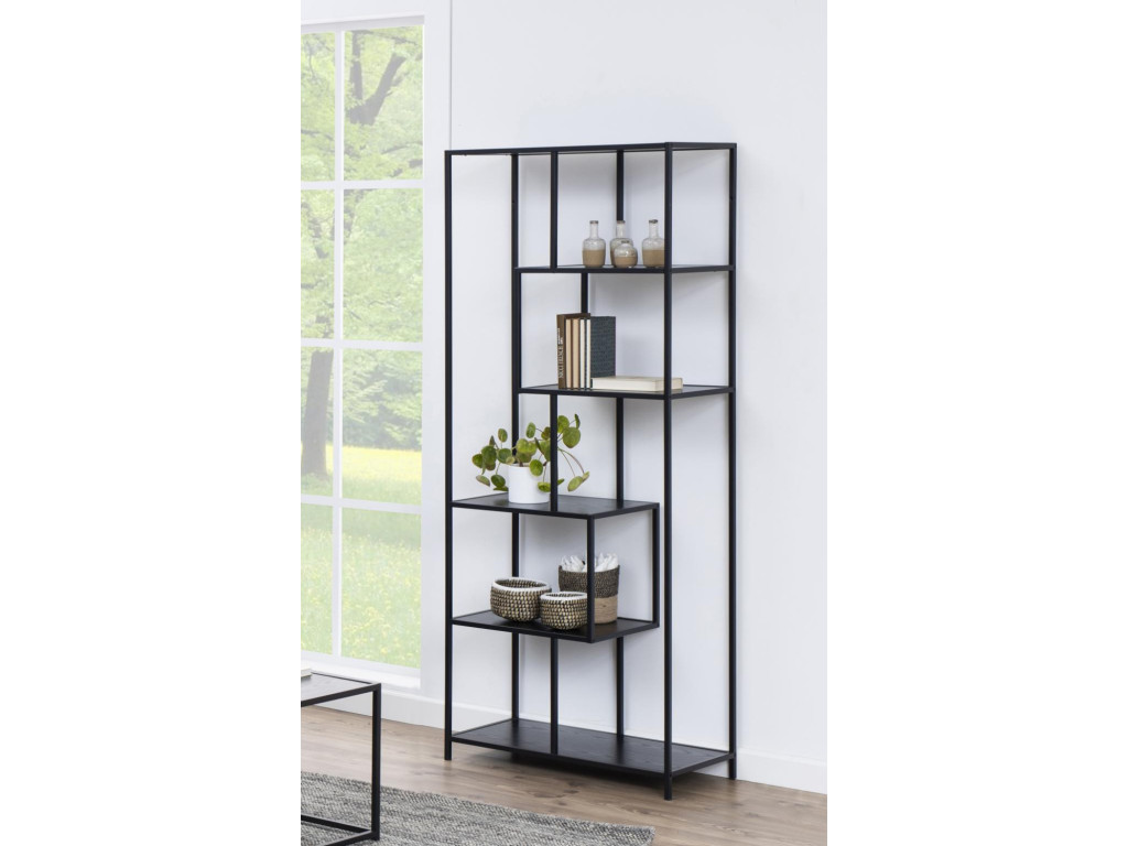 Vysoký regál Seaford ponúka maximálne využitie vertikálneho priestoru. Robustná kovová konštrukcia v čiernej matnej farbe spolu s asymetrickým rozložením políc zaisťuje atraktívny vzhľad. Skvelý na knihy aj dekorácie v štýlovej obývačke alebo kancelárii.