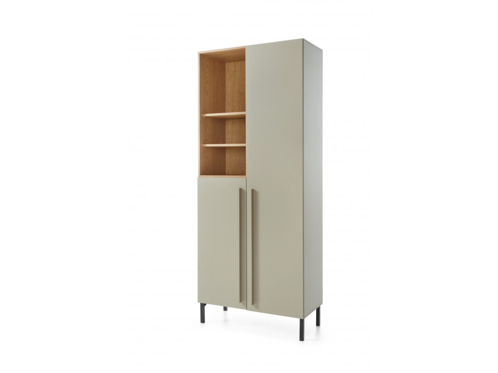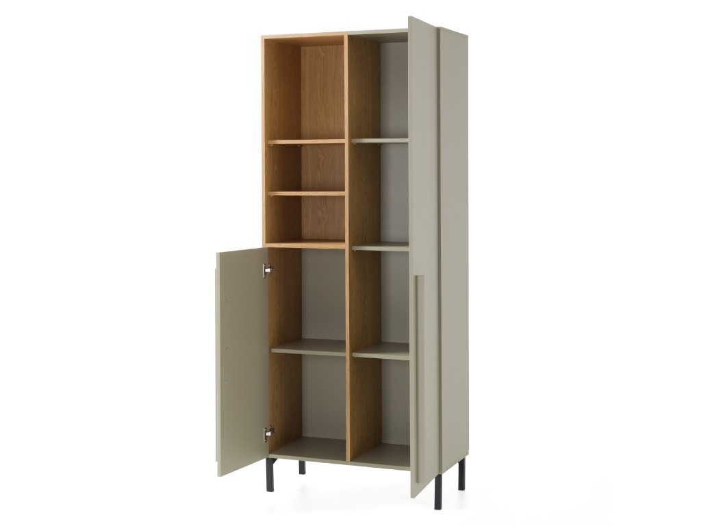 Dekoratívne prvky v podobe čiernych nožičiek dodávajú skrini zaujímavý vzhľad. Celý dizajn tvorí eukalyptovo - dubová farba. Skriňa je vyrobená z kvalitného laminátu, čo zaručuje dlhú životnosť a odolnosť. Má pevné a stabilné nohy, ktoré poskytujú spoľahlivú oporu. Výška nožičiek 15 cm.