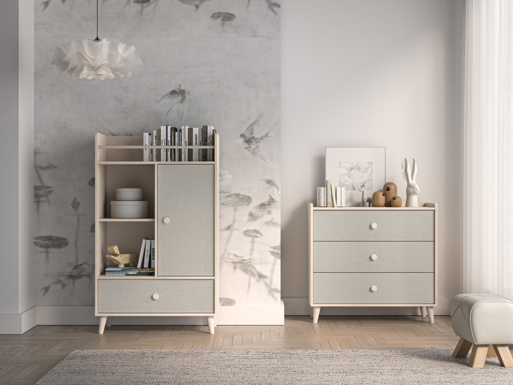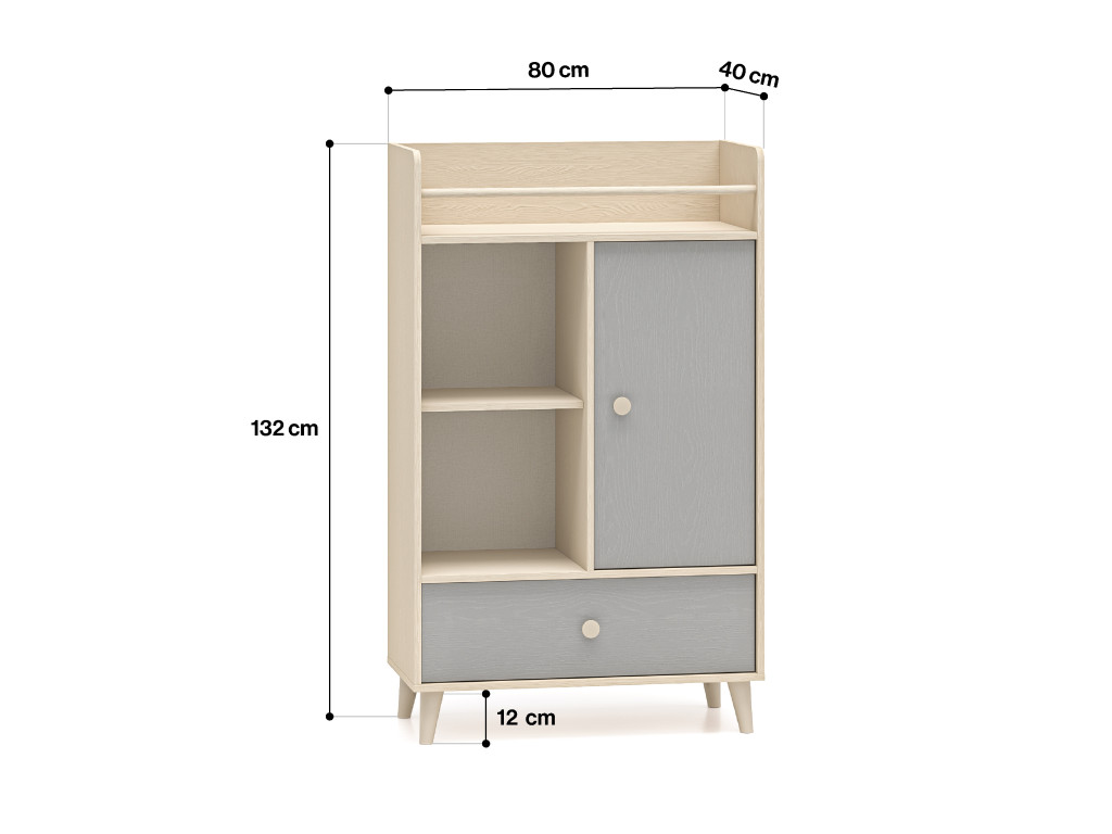 Detský regál Mevel 04 spája béžový korpus s jemným sivým dekórom, čím vytvára príjemný a útulný dojem. Je vybavený jednými dvierkami, otvorenými poličkami a vrchnou poličkou na knihy so zábranou, vďaka čomu všetko zostane na svojom mieste. V spodnej časti nájdete praktickú zásuvku, ktorá ukryje drobnosti, hračky alebo iné poklady.