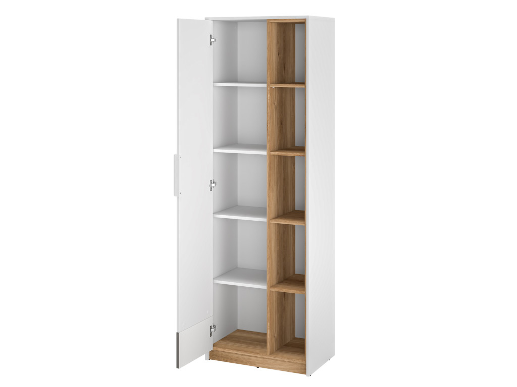 Vysoký detský regál Torino 04 je štýlovým a praktickým úložným riešením do detskej alebo študentskej izby. Tento jednodverový policový regál bez zásuviek poskytuje otvorený priestor na knihy, hračky či dekorácie, pričom zatvorená časť ukrýva ďalšie poličky na všetko, čo má byť upratané a po ruke.