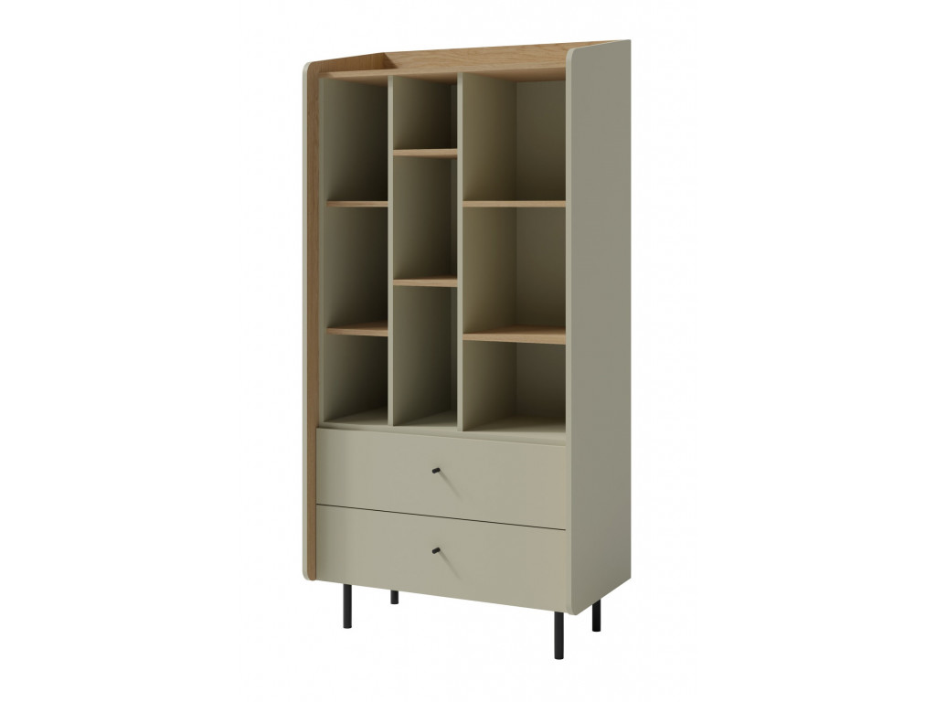 Regál z kolekcie sektorového nábytku Alesio má moderný dizajn a poteší vás aj veľkým úložným priestorom vo forme 6 otvorených políc a 2 zásuvkami. Moderný vzhľad regálu zabezpečuje kombinácia eukalyptovej a dubovej farby doplnená čiernymi kovovými nožičkami.