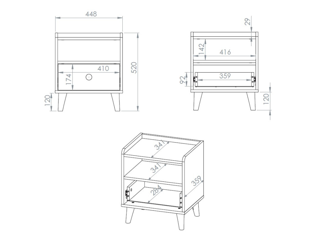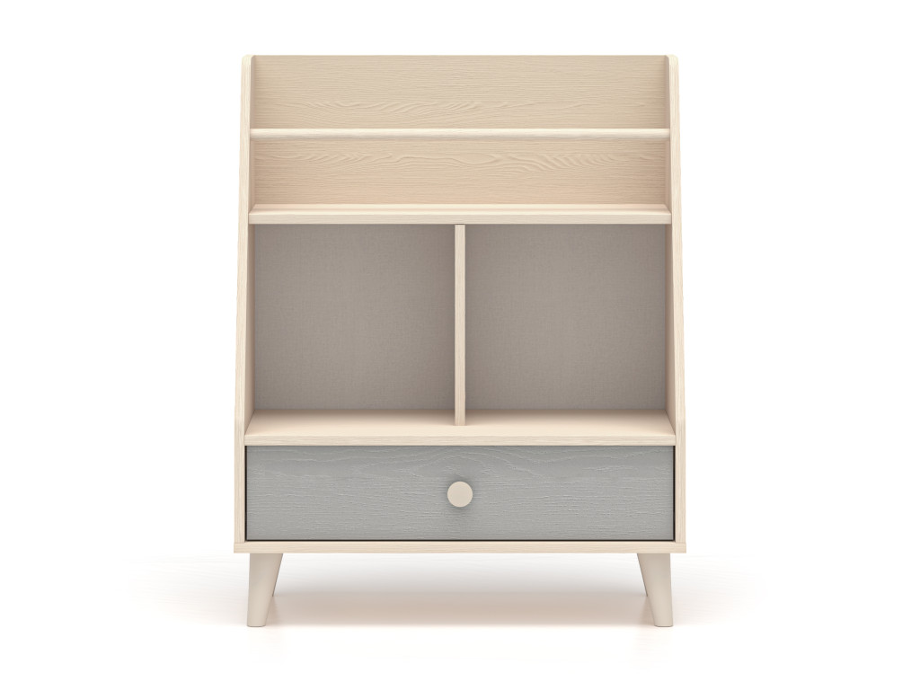 Regál do detskej izby Mevel 09 spája jemný béžový korpus so sivými prvkami a vytvára tak útulnú atmosféru aj v menšom priestore. Vďaka nižšej konštrukcii naň ľahko dosiahnu aj menšie deti, aby mali svoje knihy, hračky či potreby na tvorenie vždy poruke. Horná polička so zábranou, otvorená polička a spodná zásuvka zároveň ponúkajú dostatok úložného priestoru na všetko dôležité.