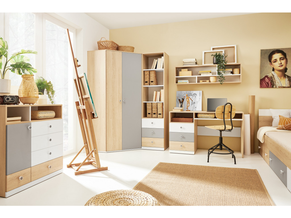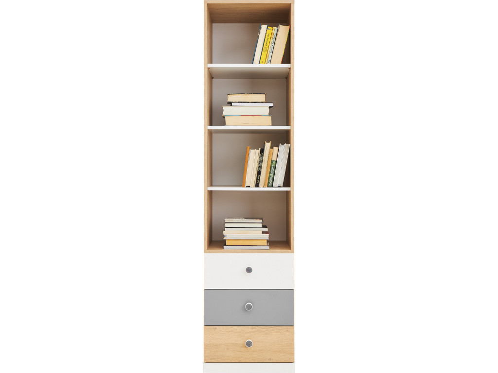 Vysoký regál Pixel 06 je moderným kusom nábytku, ktorí sa hodí hlavne do detských izieb. Biela, prírodná a sivá farba zaistí jednoduchý a príjemný vzhľad interiéru. Úložný priestor akým regál disponuje zaujme najmä tínedžerov. Regál ponúka 4 priestranné otvorené police na vystavenie kníh, hračiek a dekorácií. Okrem toho je vybavený 3 zásuvkami s modernými úchytkami.
