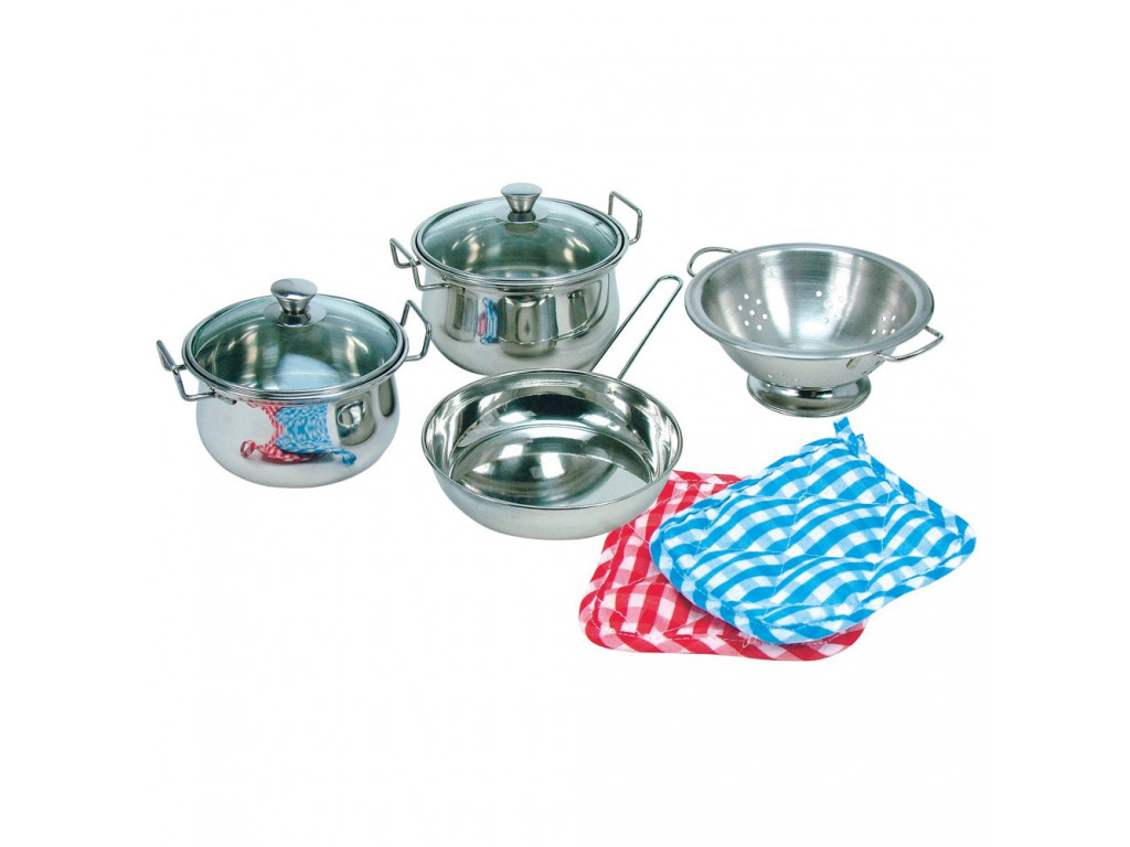 - 2 hrnce s pokrievkami, panvica, cedník a 2 chňapky