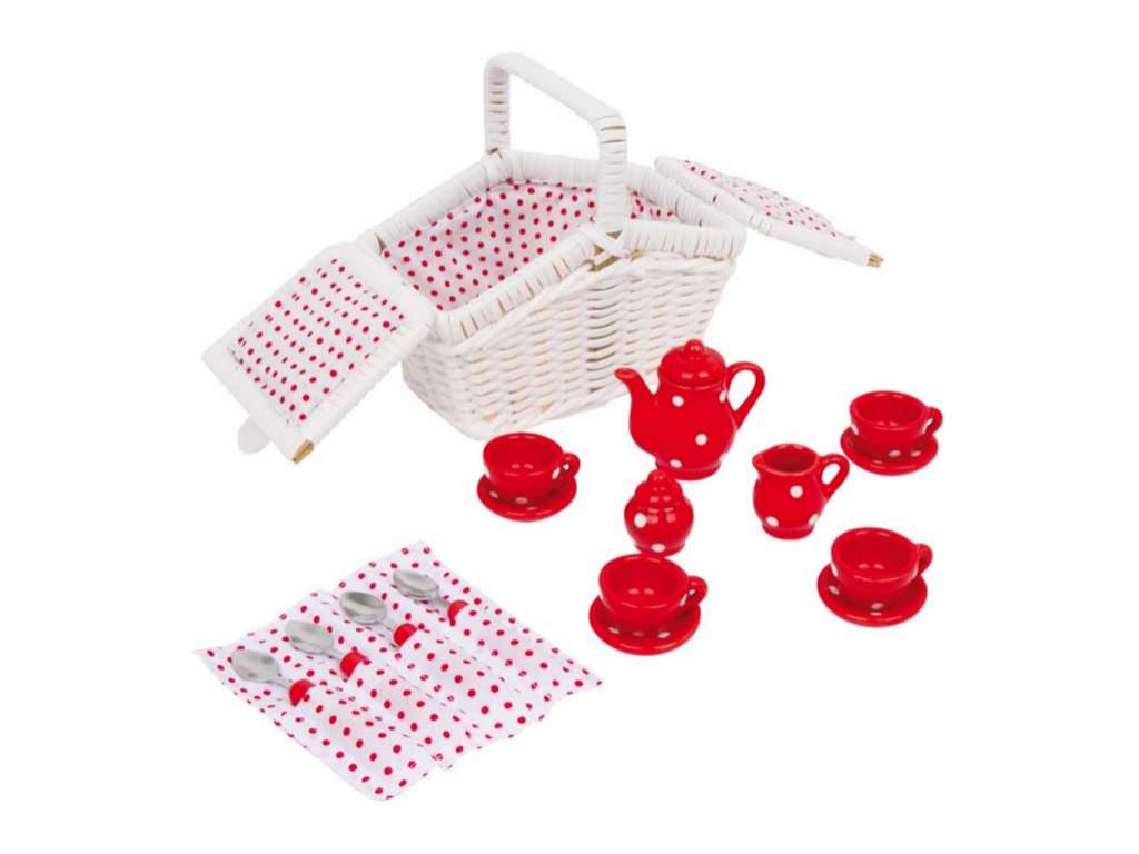 17-dielna súprava v piknikovom košíku z umelého prútia je ako stvorená na posedenie v záhrade pri čaji. Roztomilé bodky vyčarujú úsmev na detských tváričkách.