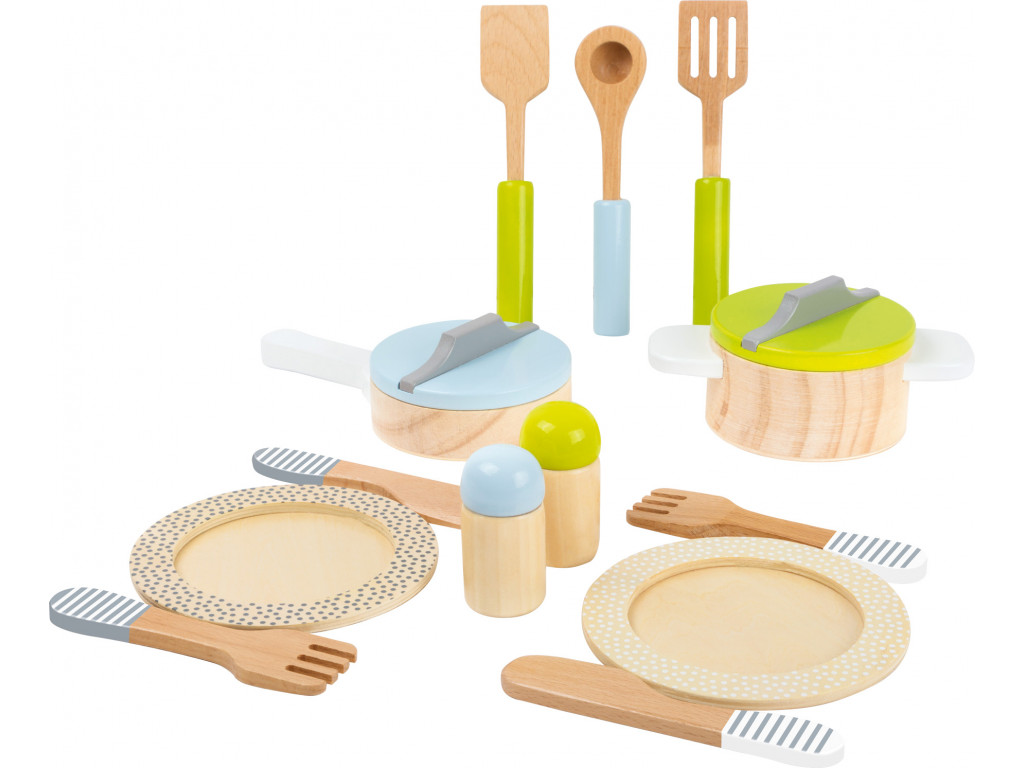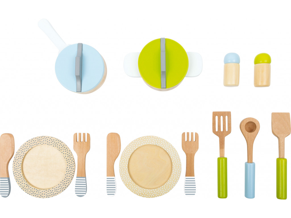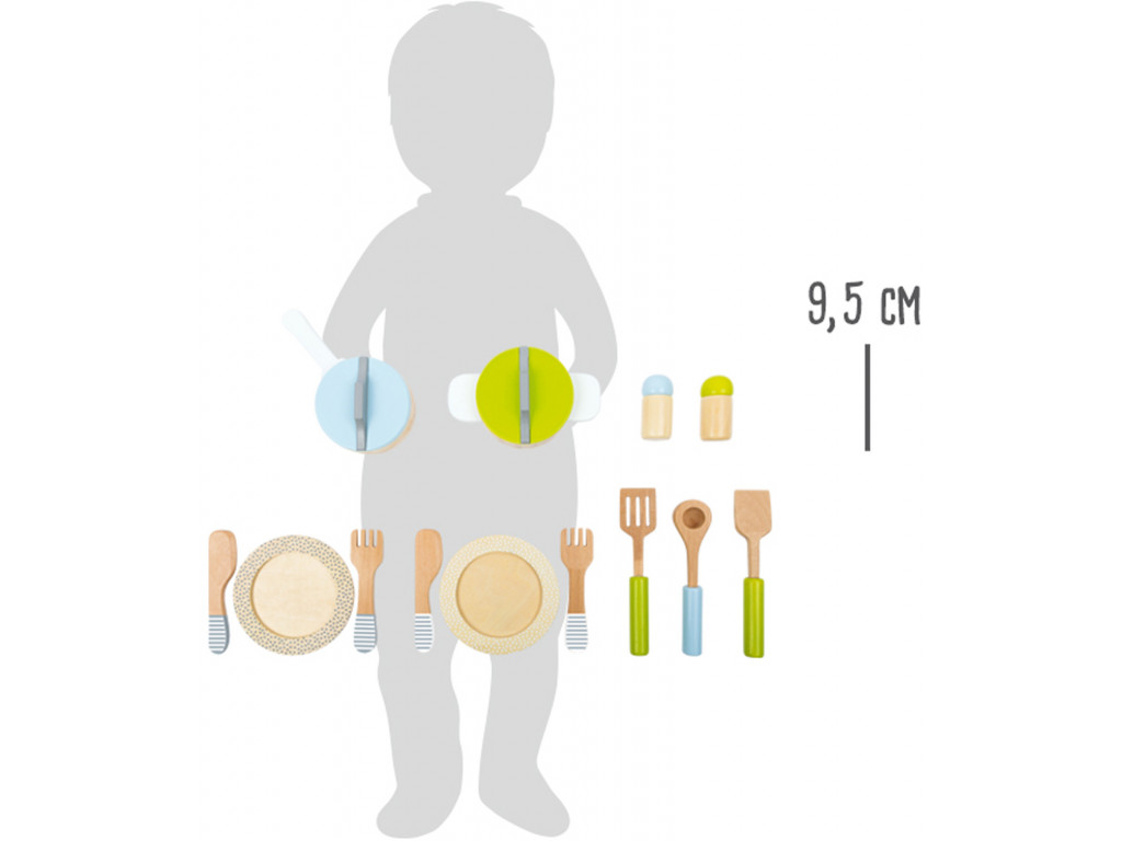S týmto farebným riadom z robustného dreva je varenie pre hostí skvelou zábavou. Odnímateľné pokrievky riadu sa ľahko uchopujú. Týmto spôsobom sa môže detská kuchyňa v okamihu stať kuchyňou špičkového šéfkuchára. Deti môžu zároveň trénovať sociálne kompetencie a používanie príborov! Takže hurá do varenia!