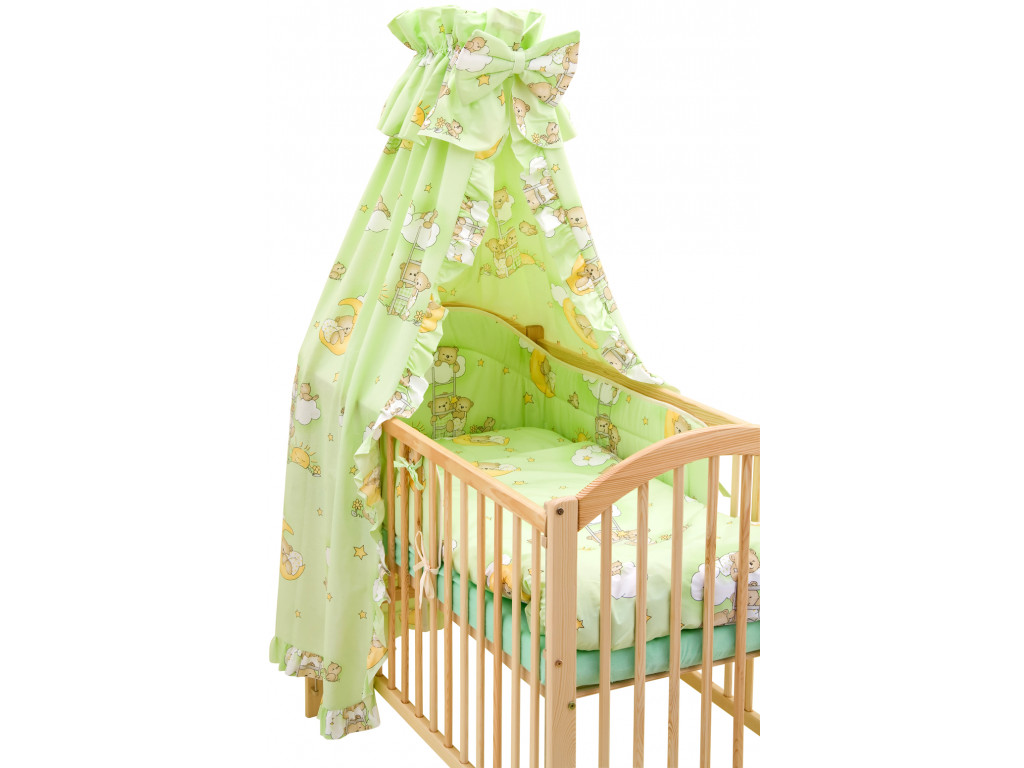 Zelená 4-dielna výbava Mráčik je vybavená obliečkami na perinku a vankúš, mantinelom a dizajnovým baldachýnom nad postieľku. S touto výbavou bude každá detská postieľka vyzerať perfektne.