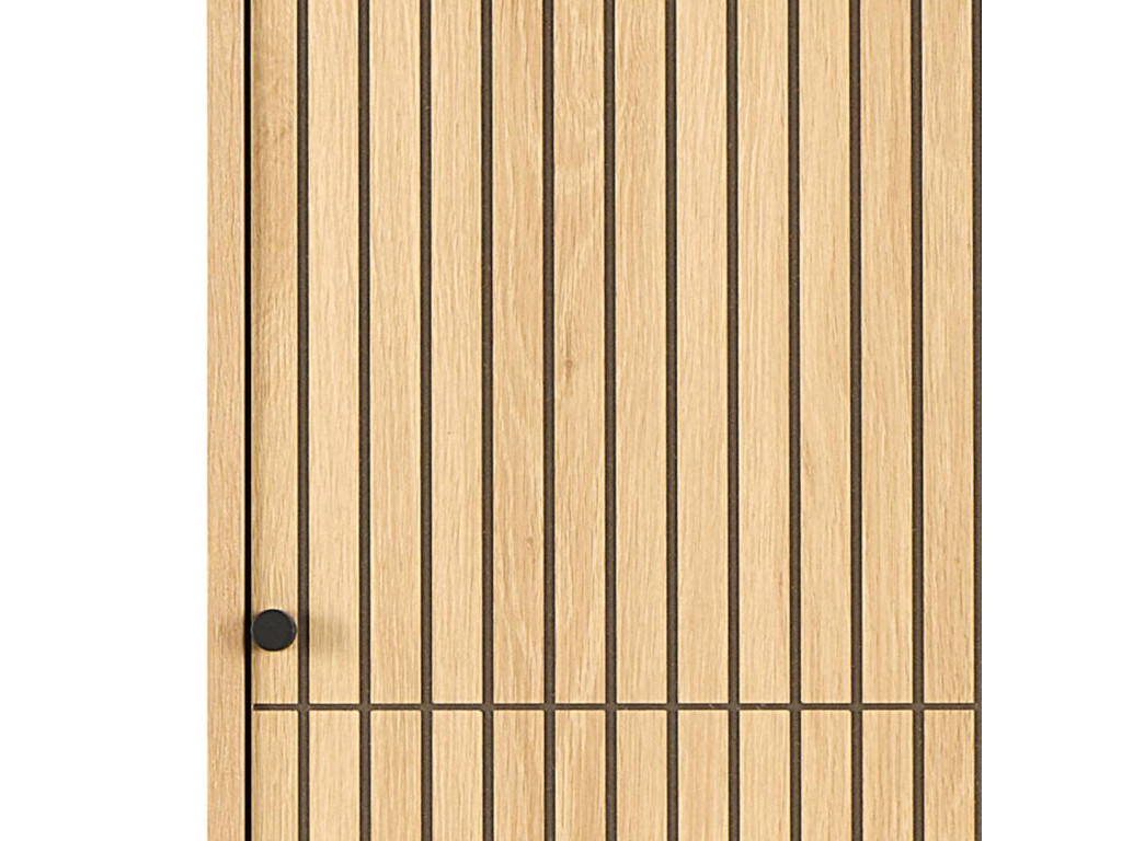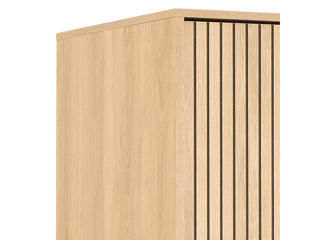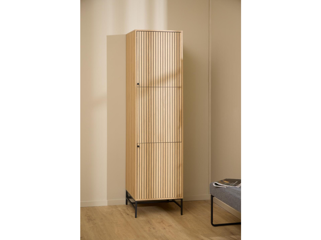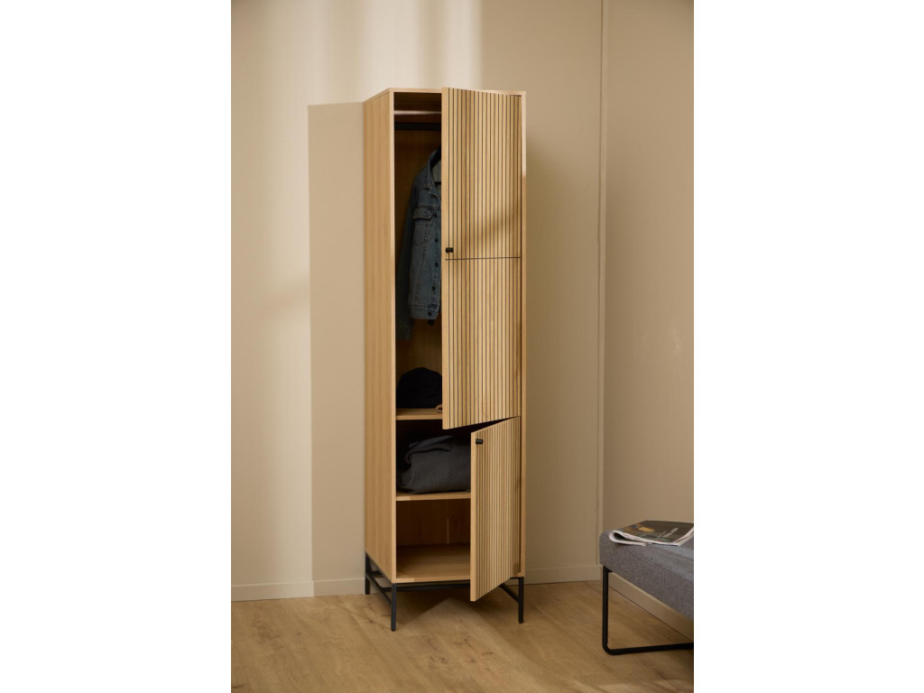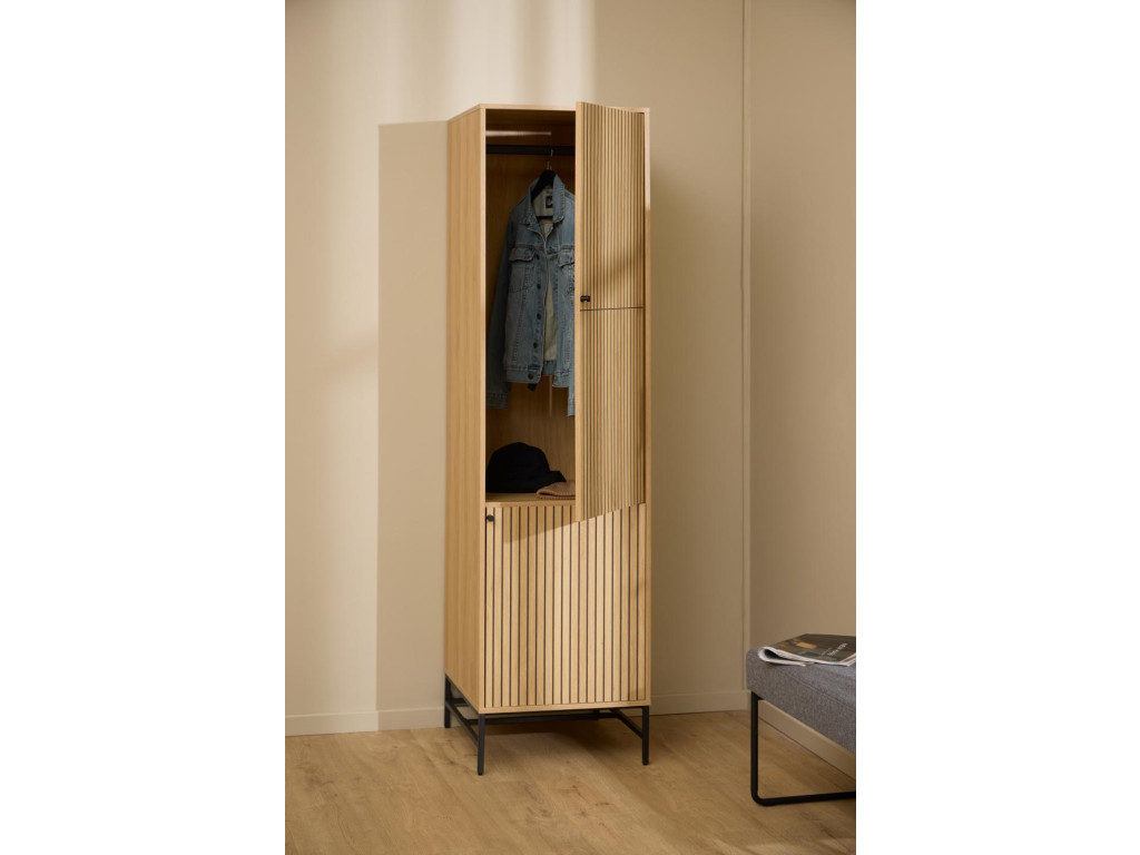 Šatníková skriňa Albany s lamelovým čelom a praktickou ClothesBar tyčou ponúka dostatok priestoru a elegantný vzhľad. Spojenie dubového dekoru s čiernym kovom vytvára moderný kontrast. Vhodná do spálne či chodby.