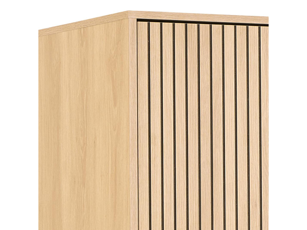 Šatníková skriňa Albany so štyrmi dverami vyniká vyváženým dizajnom, kde sa spája prírodný vzhľad dubového melamínu s moderným prvkom – lamelovým čelom. Vďaka svojim rozmerným proporciám (99 × 60 × 200 cm) ponúka veľkorysý úložný priestor rozdelený do 6 políc a 1 tyče na oblečenie, čím pokryje potreby aj väčšej domácnosti. Je ideálna do spální, šatníkov alebo predsiení, kde je potrebné uskladniť oblečenie prehľadne a štýlovo.