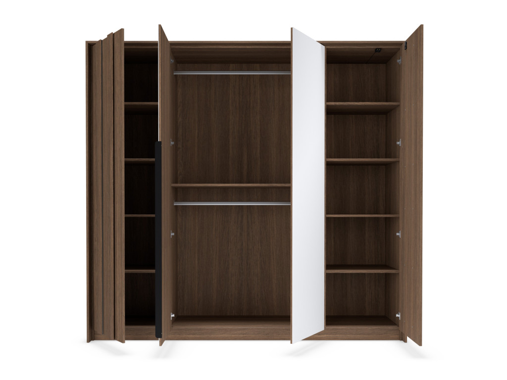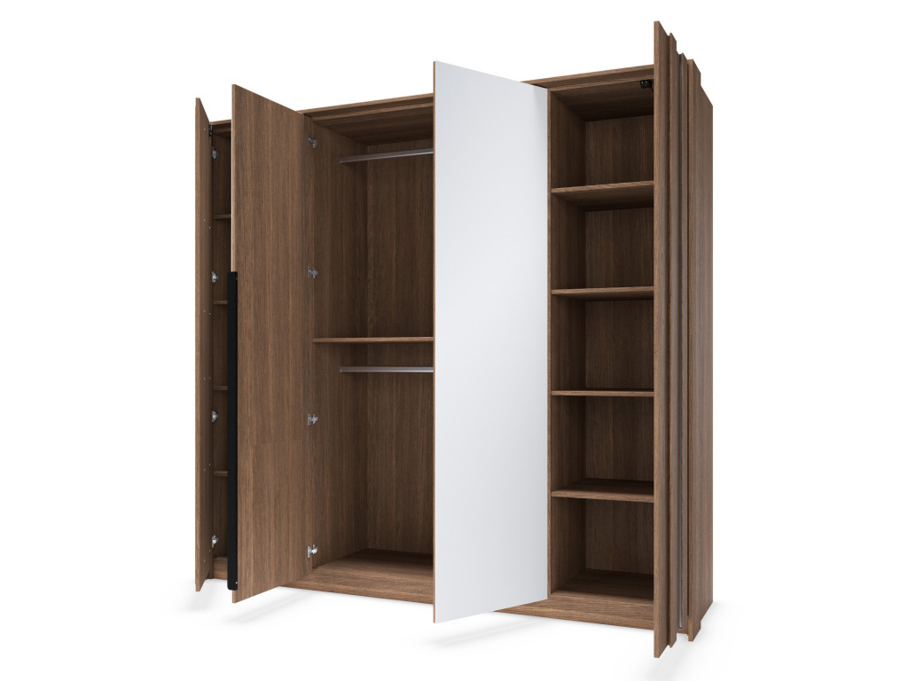 Skriňa je vybavená štyrmi dverami, pričom stredné dvere sú so zrkadlom. Vnútorný priestor ponúka dve tyče na zavesenie odevov a police v bočných častiach pre prehľadné uskladnenie. Vyhotovená je v dekore dub tmavý (dunin) s dôrazom na moderný dizajn s MDF lištami a LED osvetlením na frontoch.