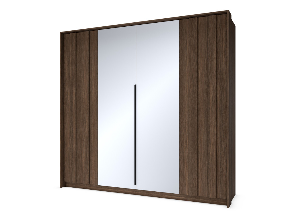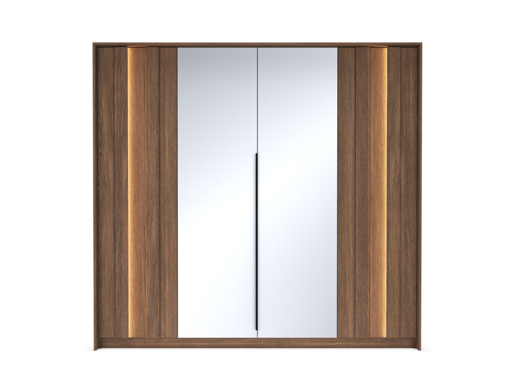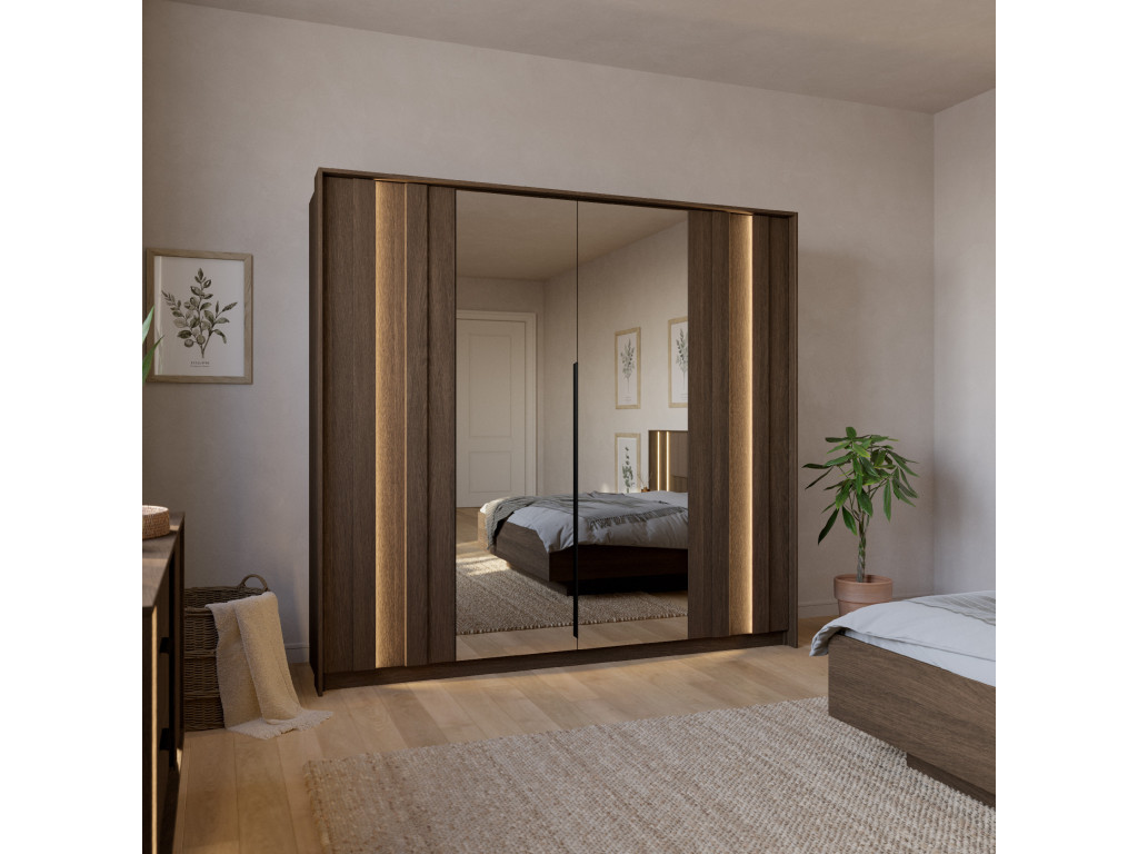 Šatníková skriňa Amaro E v dekore dub tmavý (dunin) ponúka veľkorysý a prehľadne riešený úložný priestor pre vaše oblečenie. Vďaka štyrom dverám, z ktorých stredné sú so zrkadlom, pôsobí prakticky aj opticky zväčšuje priestor. Bočné časti s LED osvetlením na frontoch dodávajú skrini moderný a elegantný vzhľad. Vnútorné usporiadanie s dvomi tyčami na zavesenie a policami po bokoch zabezpečuje jednoduchú organizáciu. Ideálna voľba pre štýlovú a funkčnú spálňu.