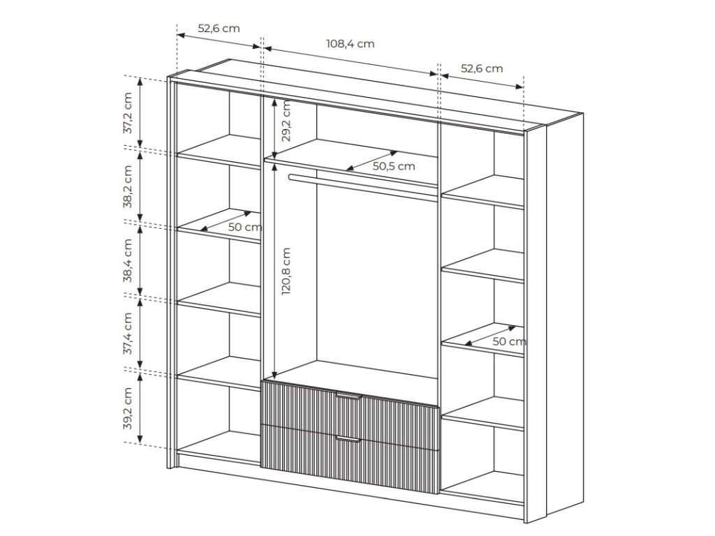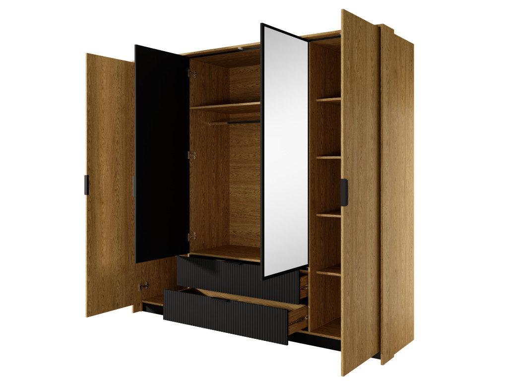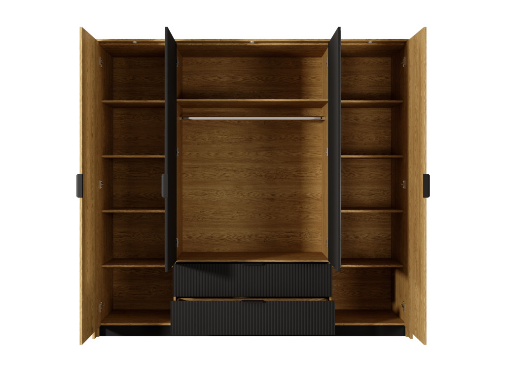 Vnútro skrine je prakticky rozdelené do viacerých častí. Stredná sekcia so zrkadlovými dverami obsahuje hornú policu, pod ňou vešiakovú tyč a dve priestranné zásuvky v spodnej časti. Čierne lamelové fronty dodávajú tejto časti výrazný moderný vzhľad. Bočné časti tvoria uzavreté skrinky s viacerými policami, ideálne na uskladnenie zloženého oblečenia či doplnkov. Kvalitu a komfort používania zabezpečujú tiché dovieranie dvierok a zásuviek s plným výsuvom.