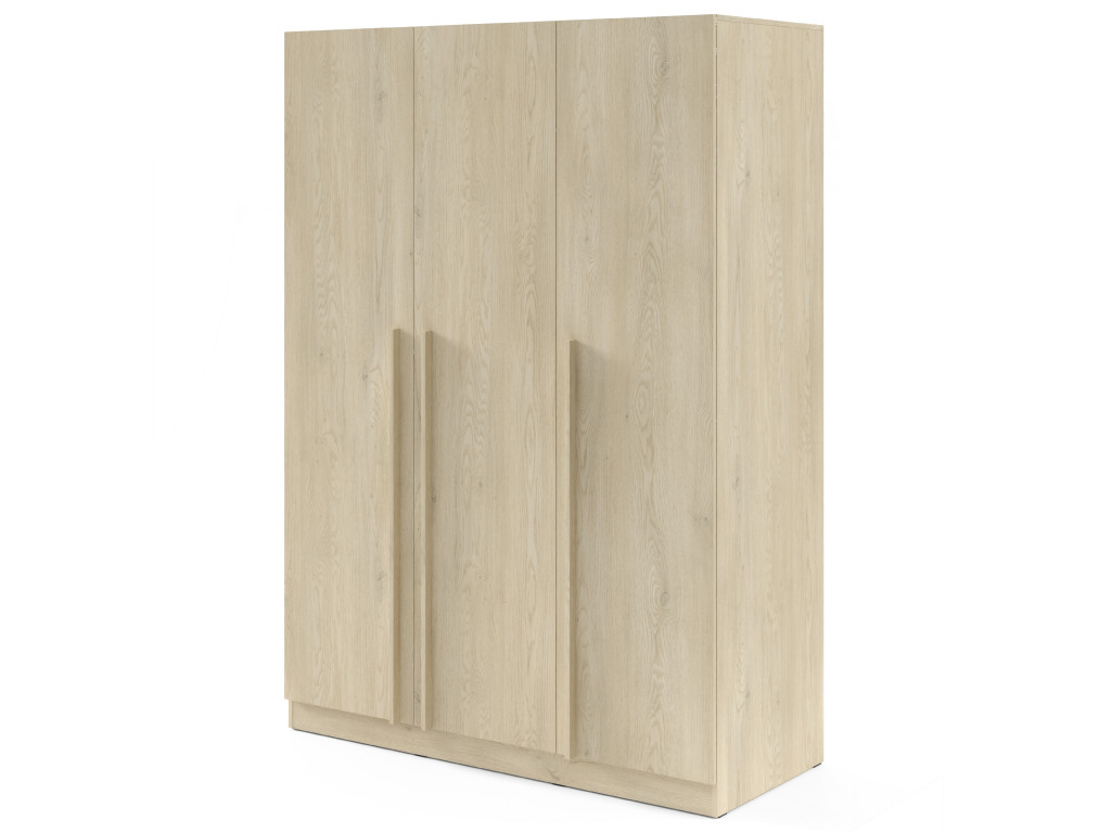 3-dverová šatníková skriňa Braga BR2 v krémovom dube, ponúka prakticky rozdelený úložný priestor. Širšia časť skrine je vybavená šatníkovou tyčou a policami, zatiaľ čo užšia časť obsahuje police a dve menšie zásuvky ukryté za dverami.