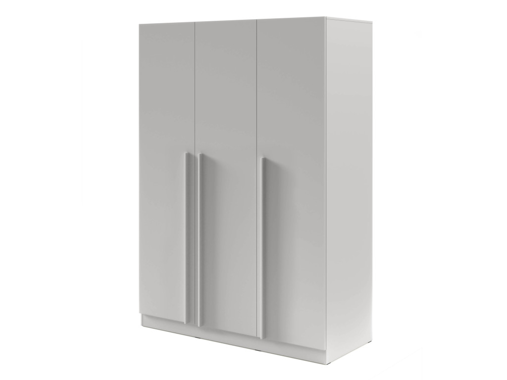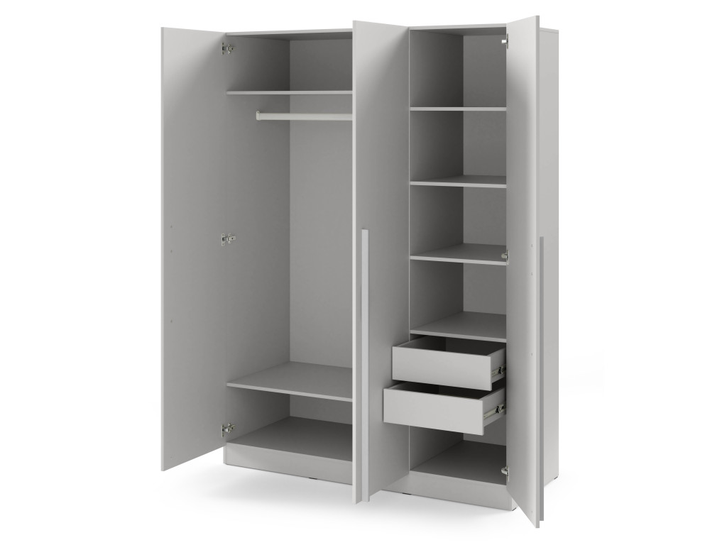 Sivá 3-dverová šatníková skriňa Braga BR2 ponúka prakticky rozdelený úložný priestor. Širšia časť skrine je vybavená šatníkovou tyčou a policami, zatiaľ čo užšia časť obsahuje police a dve menšie zásuvky ukryté za dverami.