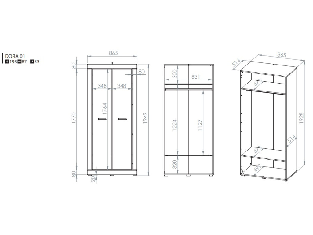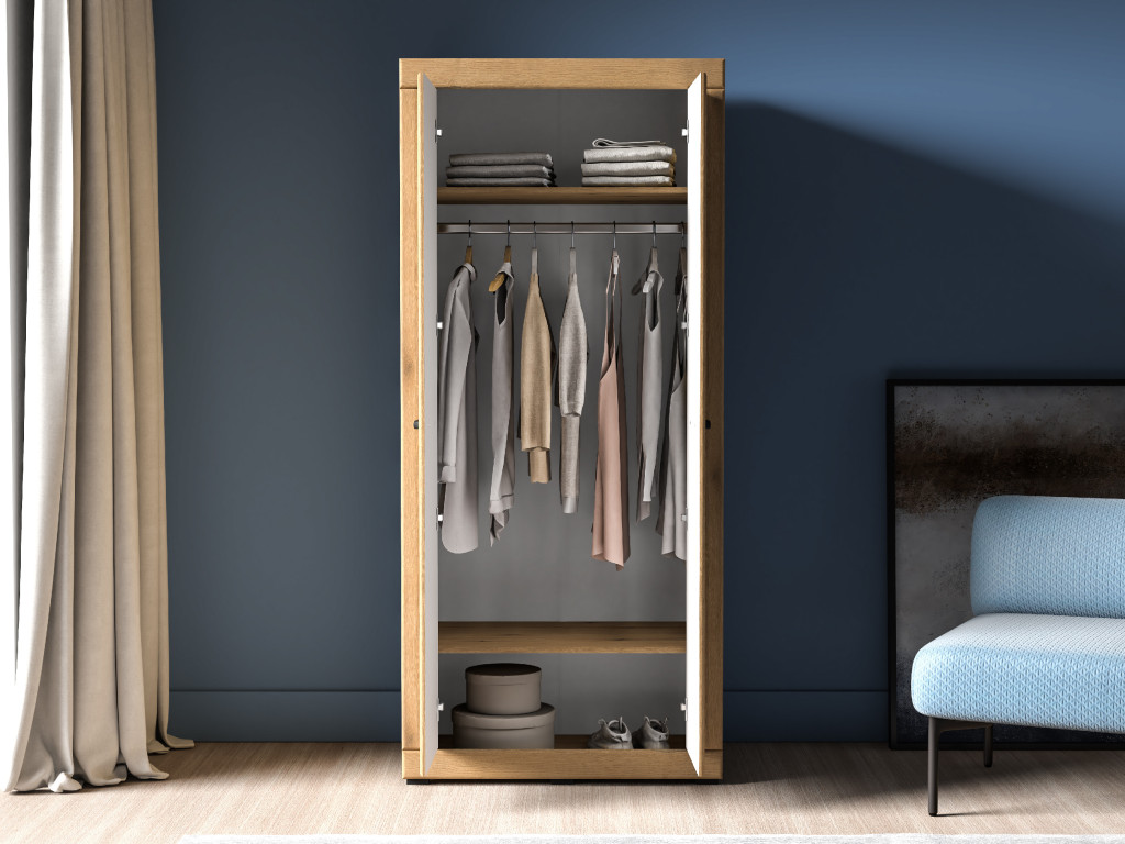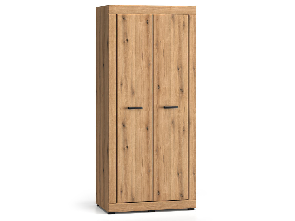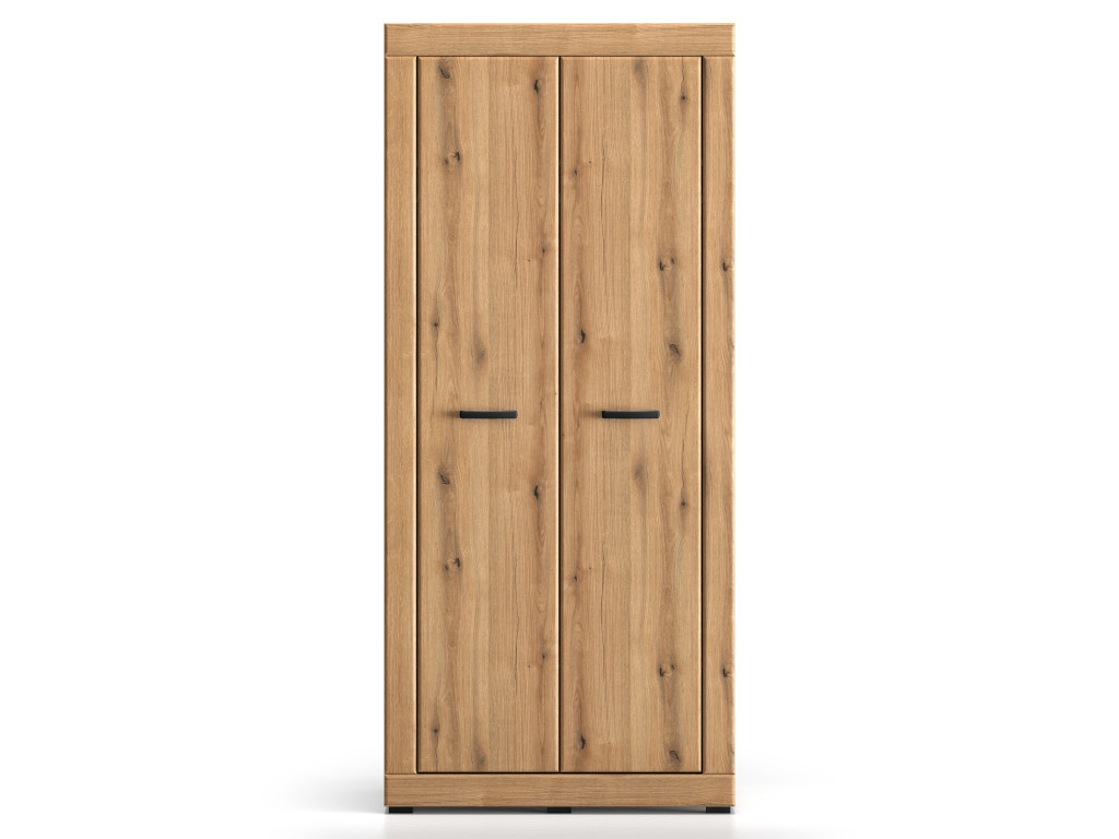 Šatníková skriňa Dora 01 je praktickým riešením pre prehľadné uloženie oblečenia v spálni či obývačke. Na rozmeroch 87 × 53 × 195 cm ponúka vešiakovú tyč na kabáty alebo košele, hornú policu na sezónne veci či doplnky a spodnú policu na obuv alebo úložné boxy. Dvojdverové prevedenie umožňuje jednoduchý prístup ku všetkému uloženému obsahu.