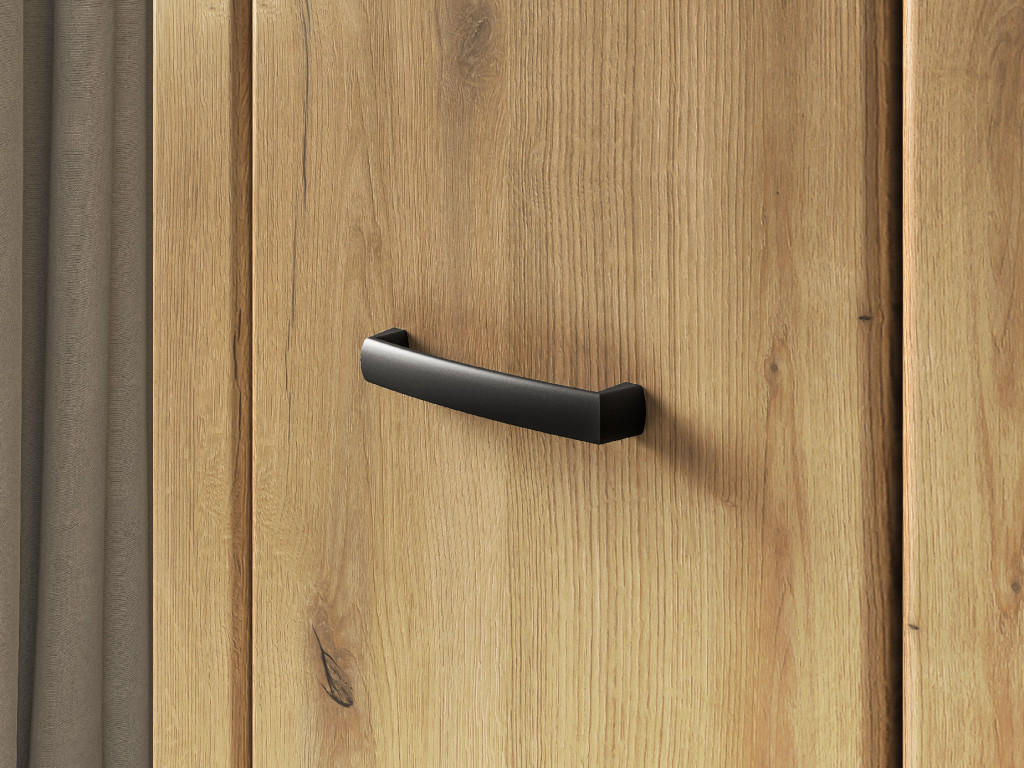 Elegantné vyhotovenie v dekore dub Evoke pôsobí hrejivo a nadčasovo. Jemne zaoblené čelá z MDF dopĺňajú decentné čierne úchytky, ktoré kolekcii dodávajú moderný akcent. Komfort používania zabezpečuje systém tichého dovierania dvierok, vďaka ktorému je skriňa nielen štýlová, ale aj praktická.