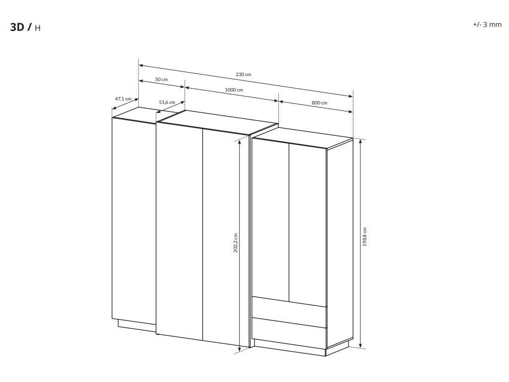 Šatníková skriňa Las 3D – biela / dub craft zlatý s rozmermi 230 × 51,6 × 202,2 cm je rozdelená na tri sektory – ľavá časť s policami a výsuvnou tyčou, stredná s policami, tyčou a vnútorným zrkadlom, pravá časť s policami a dvomi zásuvkami. Elegantné riešenie s minimalistickým push-to-open systémom.