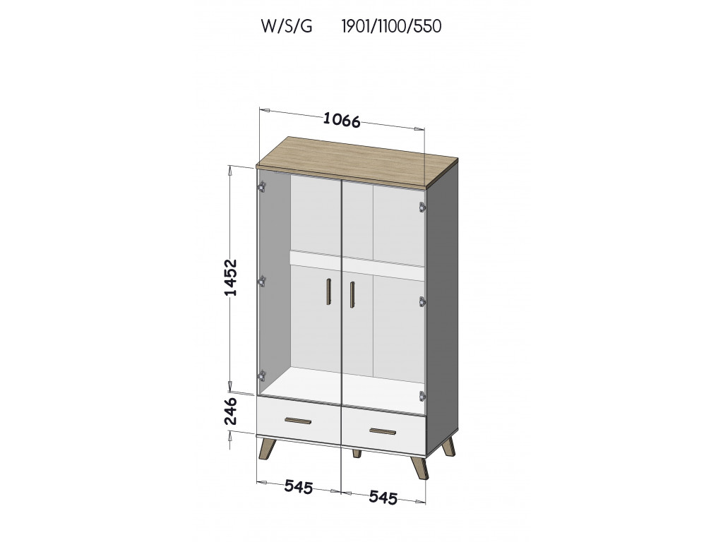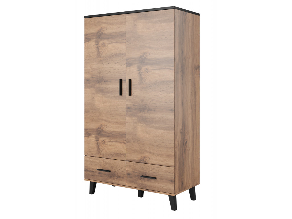 V spodnej časti skrine sa nachádzajú 2 zásuvky, ktoré využijete na uskladnenie oblečenia. Dvere sa otvárajú klasickým spôsobom úchytkami, vyrobenými z čierneho plastu. Šatníková skriňa stojí na nožičkách z čierneho plastu.