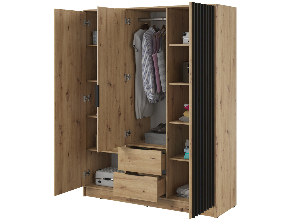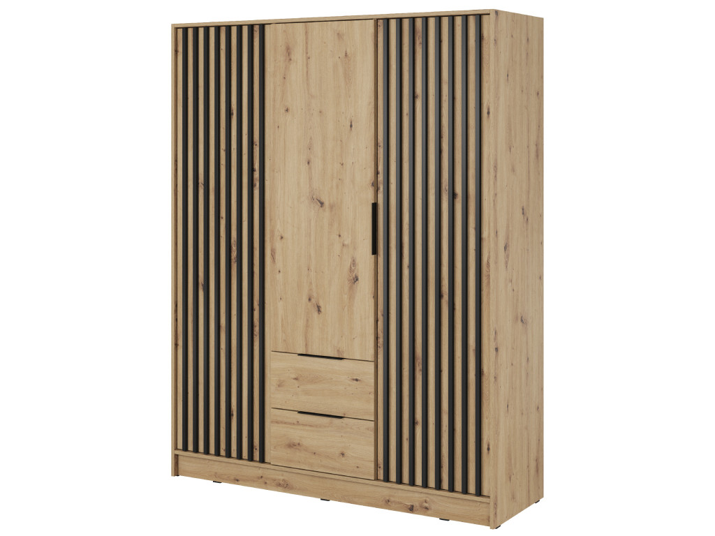 Šatníková skriňa Nelly 3D v prírodnom prevedení dub artisan s kontrastnými čiernymi lamelami vyniká nadčasovým vzhľadom a praktickým vnútorným riešením. Stredná časť skrine je vybavená širokým priestorom s vešiakovou tyčou, určeným na zavesenie každodenného aj sezónneho oblečenia. Pod ňou sa nachádzajú dve zásuvky, ktoré ponúkajú úložný priestor pre bielizeň, doplnky či menšie predmety. Bočné časti skrine ukrývajú štyri police na každej strane, čo zabezpečuje prehľadné a dostatočne priestranné uskladnenie oblečenia. Skriňa je vyrobená z laminovanej dosky s ABS hranami, doplnená o čierne plastové úchytky a zvýraznená typickými vertikálnymi frézovanými lamelami, ktoré jej dodávajú charakter a štruktúru.