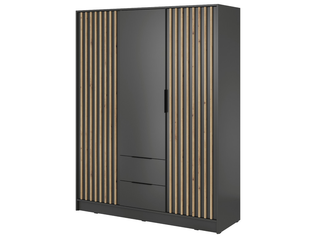 Šatníková skriňa Nelly 3D v kombinácii grafitovej farby a lamiel v dekore dub artisan je moderným riešením pre tých, ktorí hľadajú úložný priestor s výrazným vizuálnym efektom. Stredná časť skrine ponúka vešiakovú tyč, ktorá je ideálna na zavesenie košieľ, kabátov či šiat, a pod ňou sa nachádzajú dve priestranné zásuvky vhodné na bielizeň alebo doplnky. Bočné časti ukrývajú po štyroch pevných policiach, ktoré poskytujú dostatok priestoru na zložené oblečenie alebo sezónne veci. Skriňa je vyrobená z laminovanej dosky s ABS hranami, doplnená o čierne plastové úchytky a zvýraznená vertikálnymi lamelami, ktoré predným plochám dodávajú hĺbku a rytmus.