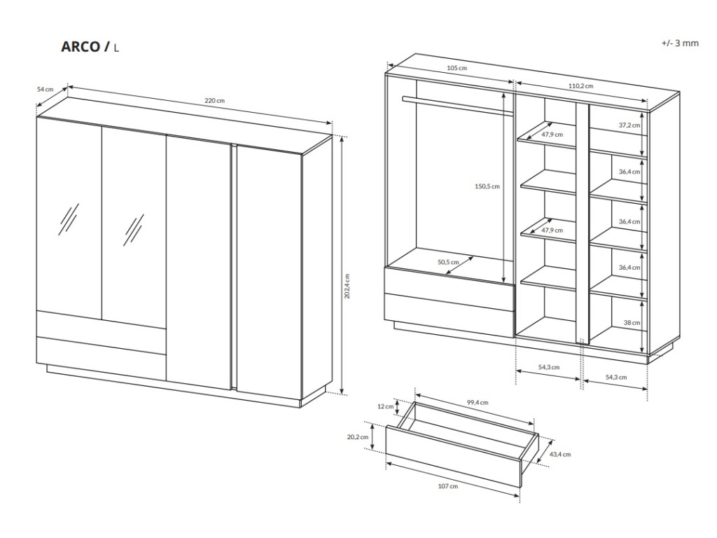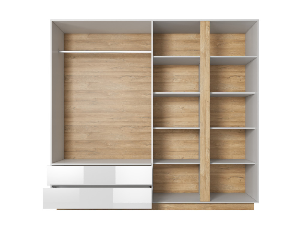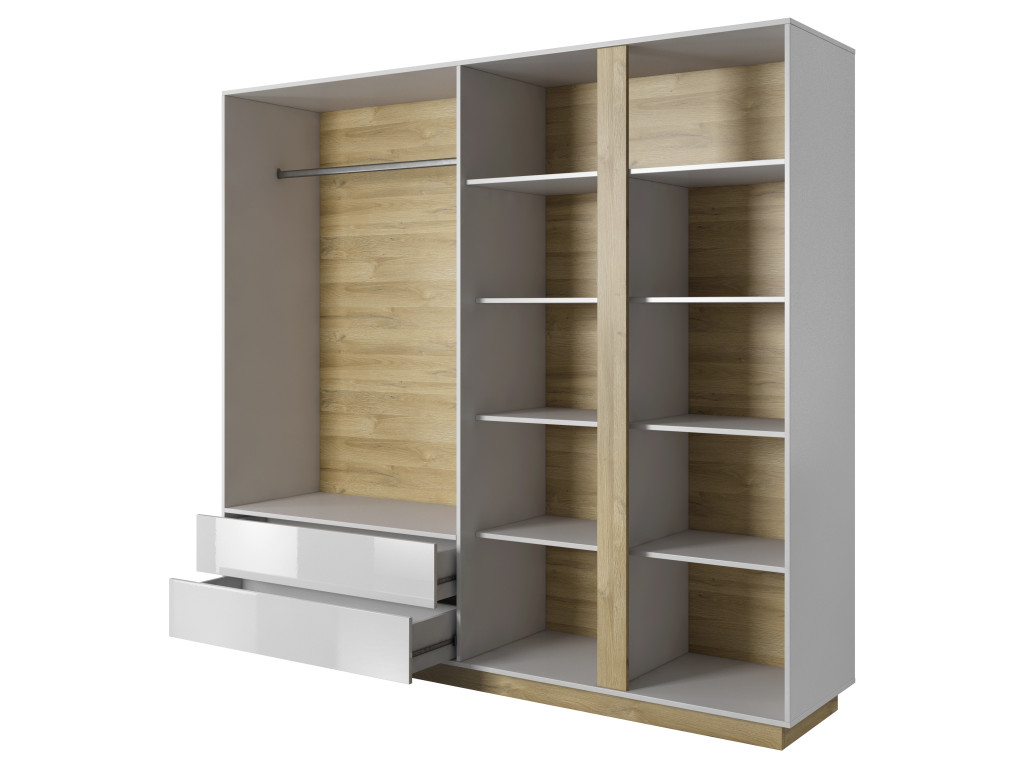 Vnútro skrine je rozdelené na dva funkčné sektory. Ľavá časť ukrytá za zrkadlovými dverami obsahuje vešiakovú tyč a v spodnej časti aj 2 zásuvky na štvrtinu výšky skrine. Pravá časť disponuje až 8 policami, ktoré ponúkajú dostatok priestoru na zložené oblečenie, doplnky či boxy. Moderný systém push-to-open a decentné hliníkové úchytky podčiarkujú minimalistický charakter skrine.