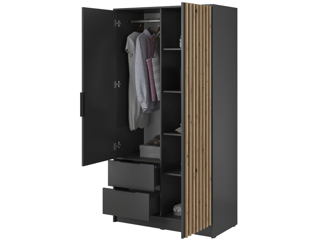 Dvojdverová šatníková skriňa Nelly 2D v kombinácii tmavého grafitového korpusu a lamiel v dekore dub artisan prináša kompaktné riešenie s moderným kontrastným vzhľadom. Predné zrkadlové dvierka opticky zväčšia priestor a zároveň poslúžia ako praktický pomocník pri každodennom obliekaní. Za nimi sa nachádza kombinovaný úložný priestor s vešiakovou tyčou na zavesenie oblečenia a štyrmi pevnými policami v bočnej časti – ideálne na uloženie zložených kúskov, doplnkov či úložných boxov. Skrinka je vyrobená z laminovanej dosky s ABS hranami, doplnená o čierne plastové úchytky a ozdobená lamelami, ktoré dodávajú prednej časti rytmus a charakter.