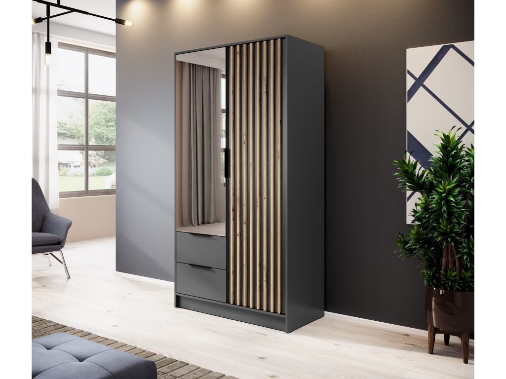 Skriňa Nelly 2D ponúka zrkadlové dvierka s vešiakovou tyčou a bočnú časť so štyrmi policami. Spojenie grafitu a dubových lamiel dodáva dizajnu charakter a hĺbku. Ideálne riešenie do menšej spálne alebo chodby. Praktický úložný priestor s moderným vzhľadom.