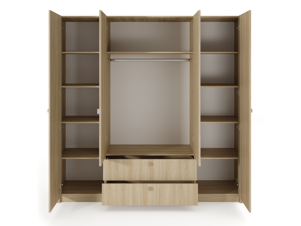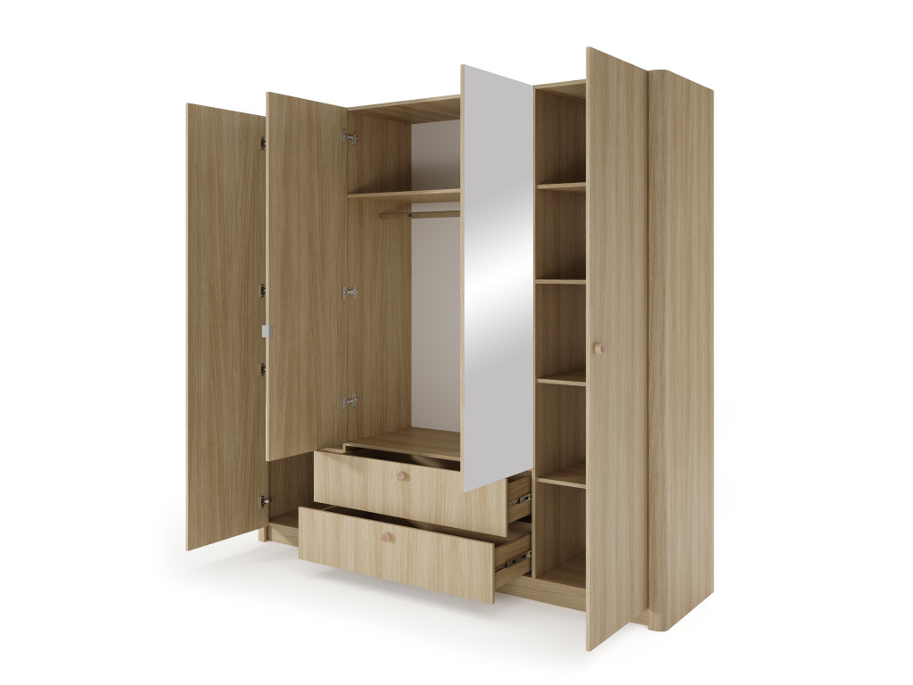 Štvordverová šatníková skriňa Viki A ponúka zrkadlové stredové dvere, dve priestranné zásuvky, vešiakovú tyč s policou a 8 bočných políc. Teplý dekor dub barista dopĺňajú drevené úchytky s moka aplikáciou a zaoblené detaily. Skriňa poskytuje veľa priestoru a zároveň pôsobí harmonicky. Skvelý doplnok do útulnej a prirodzene ladenej spálne.