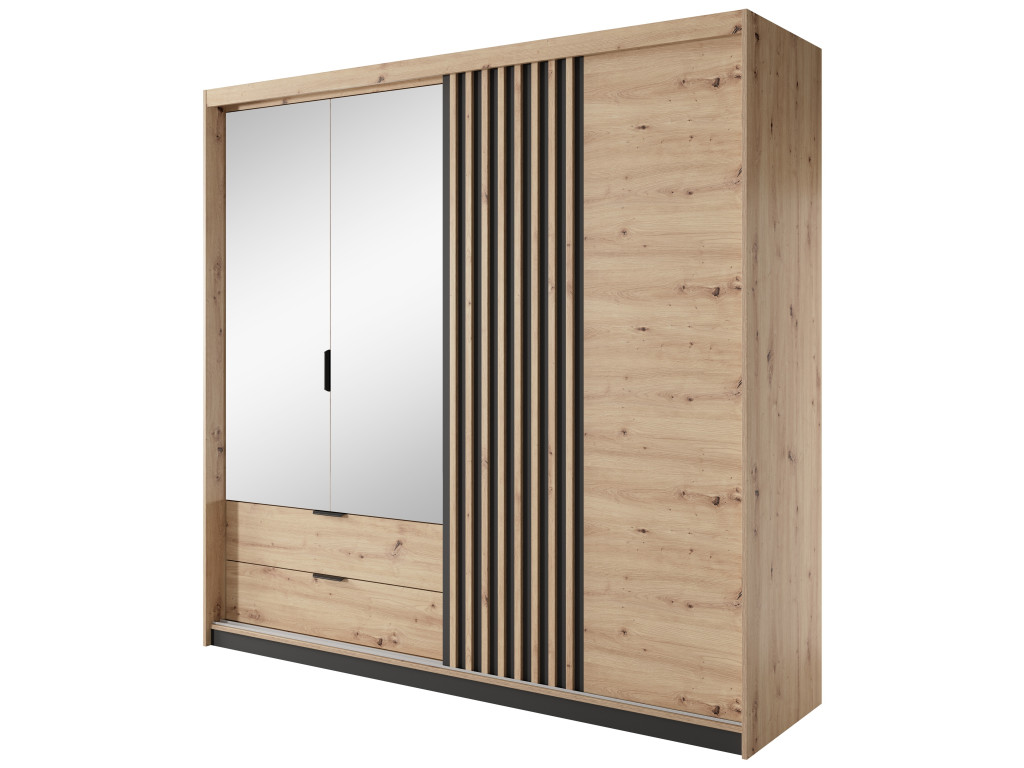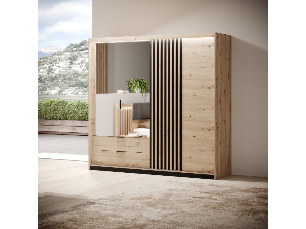 Šatníková skriňa Tally – dub artisan / antracit kombinuje otváracie zrkadlové dvere so zásuvkami na ľavej strane a posuvné dvere na pravej strane s priestorom pre vešiakovú časť. Možnosť dokúpenia LED osvetlenia, ktoré podčiarkuje moderný vzhľad skrine s antracitovými lamelami.