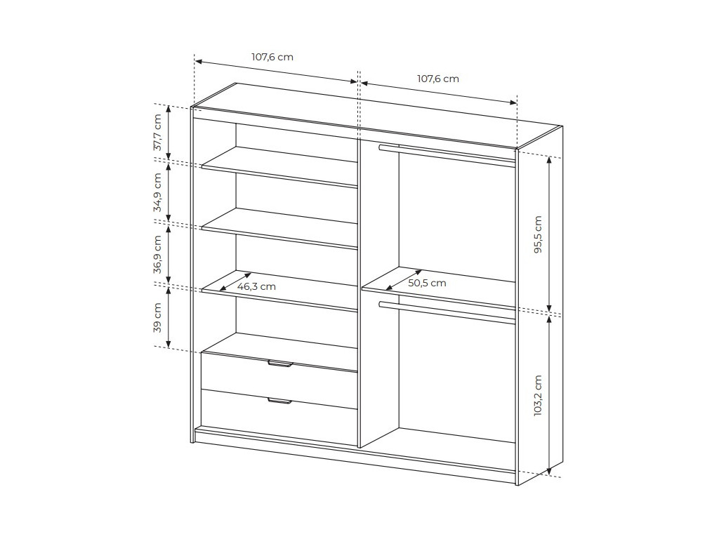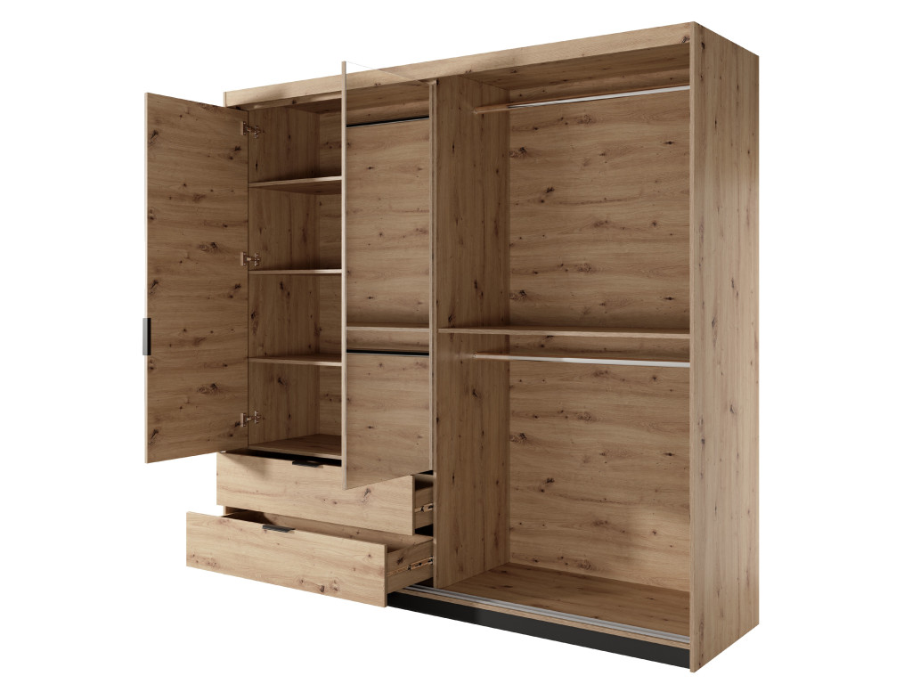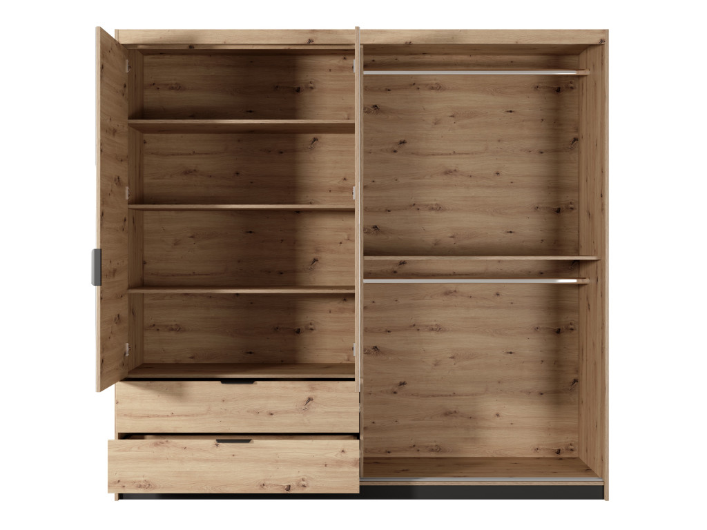 Ľavá strana skrine je riešená pomocou otváracích zrkadlových dvierok, za ktorými sa nachádzajú tri police a v spodnej časti dve priestranné zásuvky. Pravá časť disponuje jednými posuvnými dverami, za ktorými je vnútro rozdelené policou na dve sekcie – hornú a spodnú, každá s vešiakovou tyčou. Toto riešenie poskytuje kombináciu úložného priestoru na zložené aj zavesené oblečenie. Stabilitu a moderný vzhľad zaisťujú pevné čierne kovové nohy, pohodlie pri používaní zase plnovýsuvné zásuvky a systém tichého dovierania.