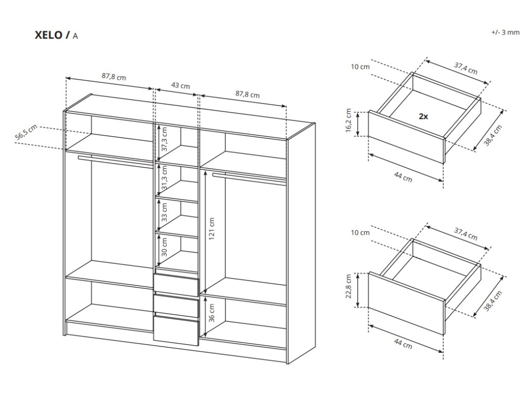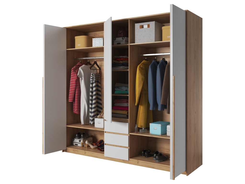 Interiér je prehľadne členený – k dispozícii sú vešiakové tyče, police a 3 malé zásuvky v strede, ktoré zabezpečia dostatok miesta na rôzne typy vecí. Praktický systém otvárania WingLine kombinuje posuvný a skladací mechanizmus, takže prístup do skrine je pohodlný a efektívny, aj keď je interiér rozdelený na viac úložných zón.